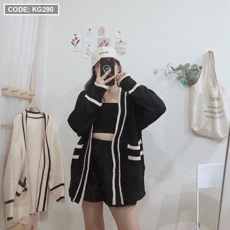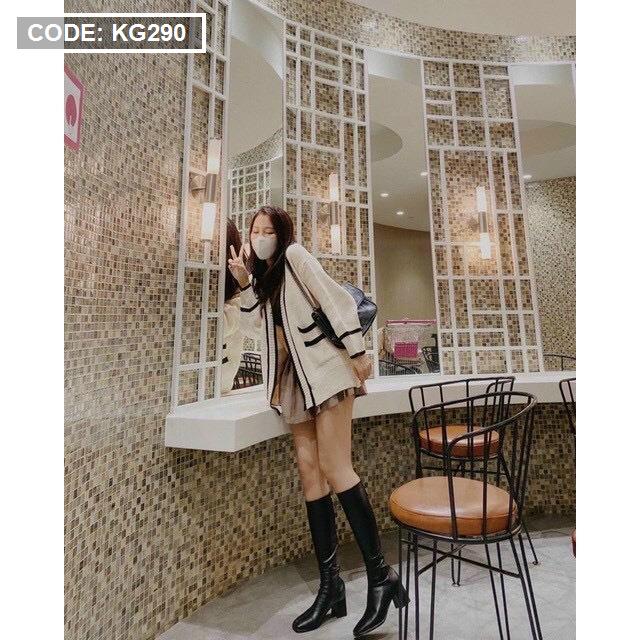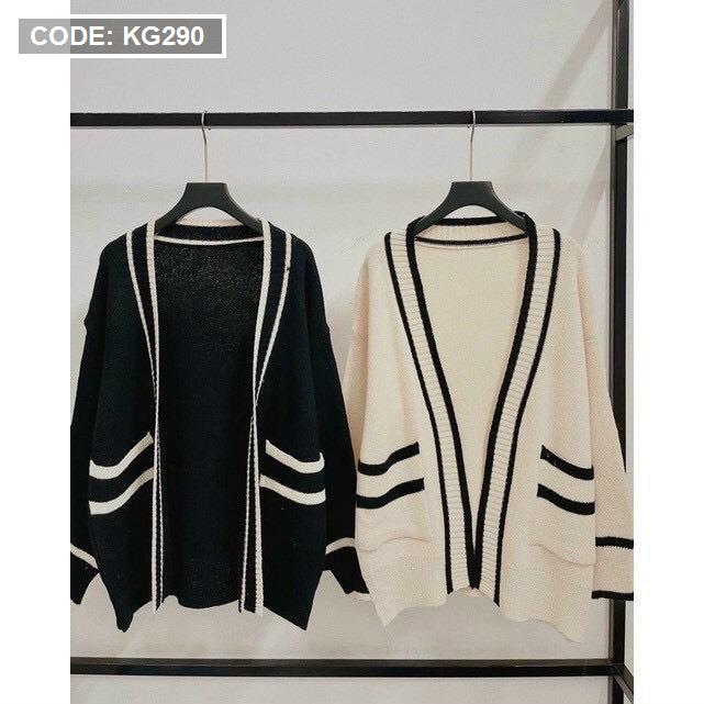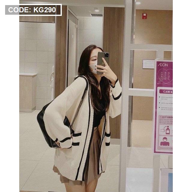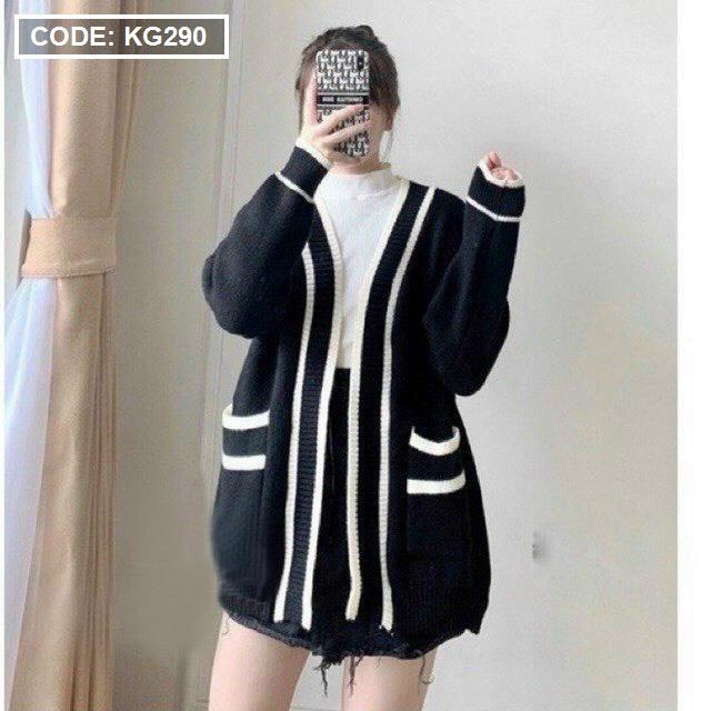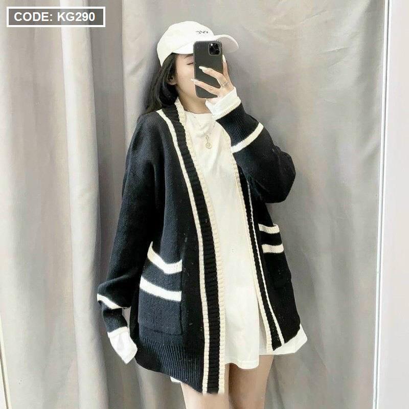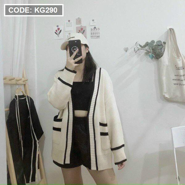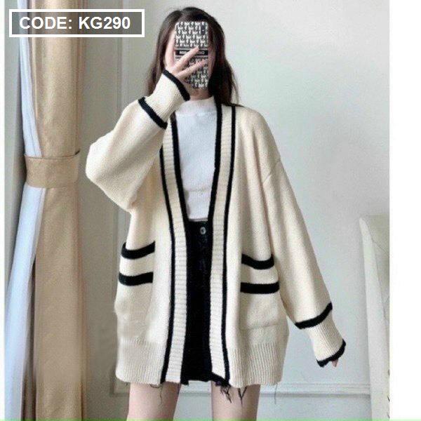 Áo khoác len nữ form rộng viền màu phối túi hai bên