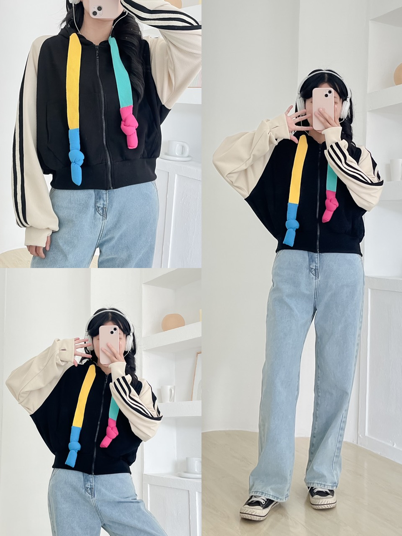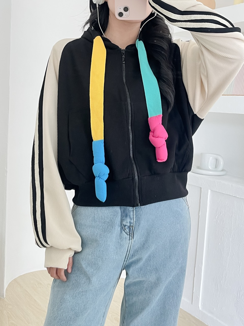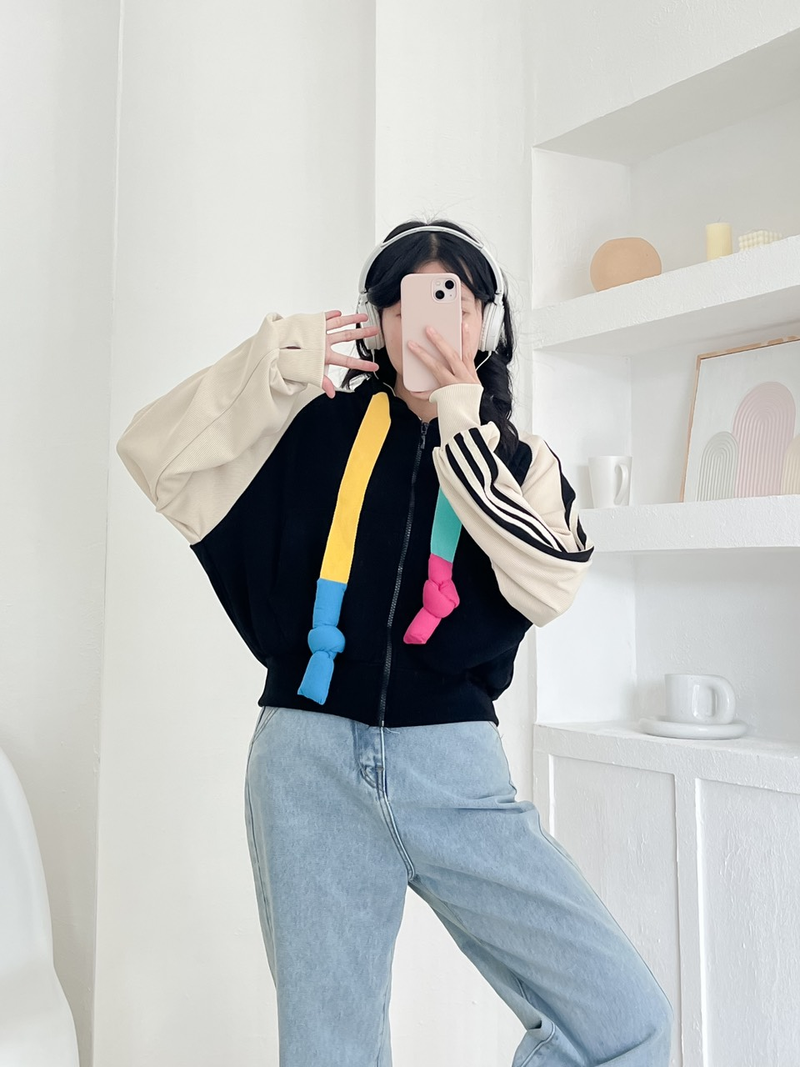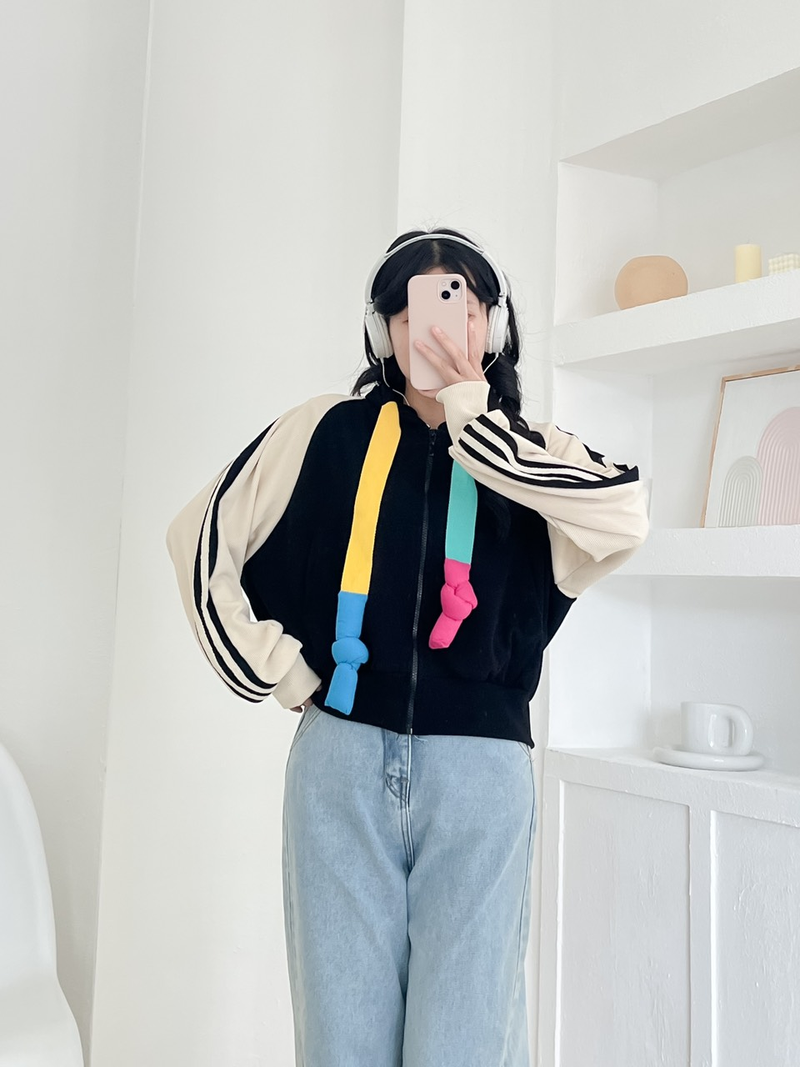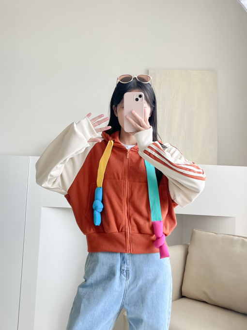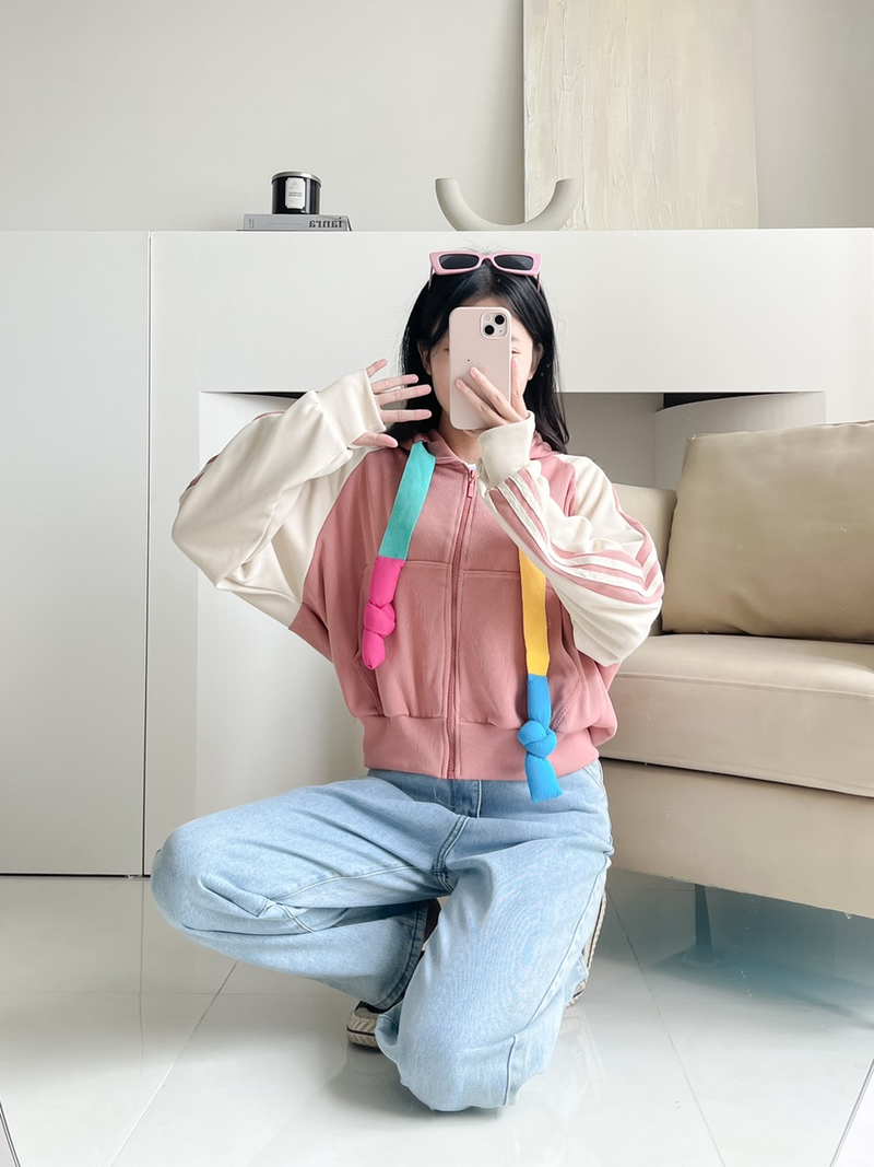 Áo khoác nữ lửng viền sọc phối dây màu cầu vòng bản to