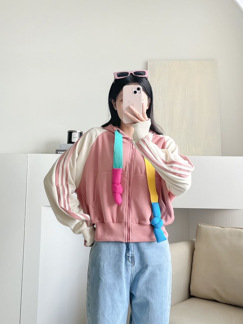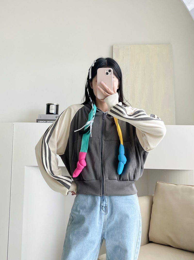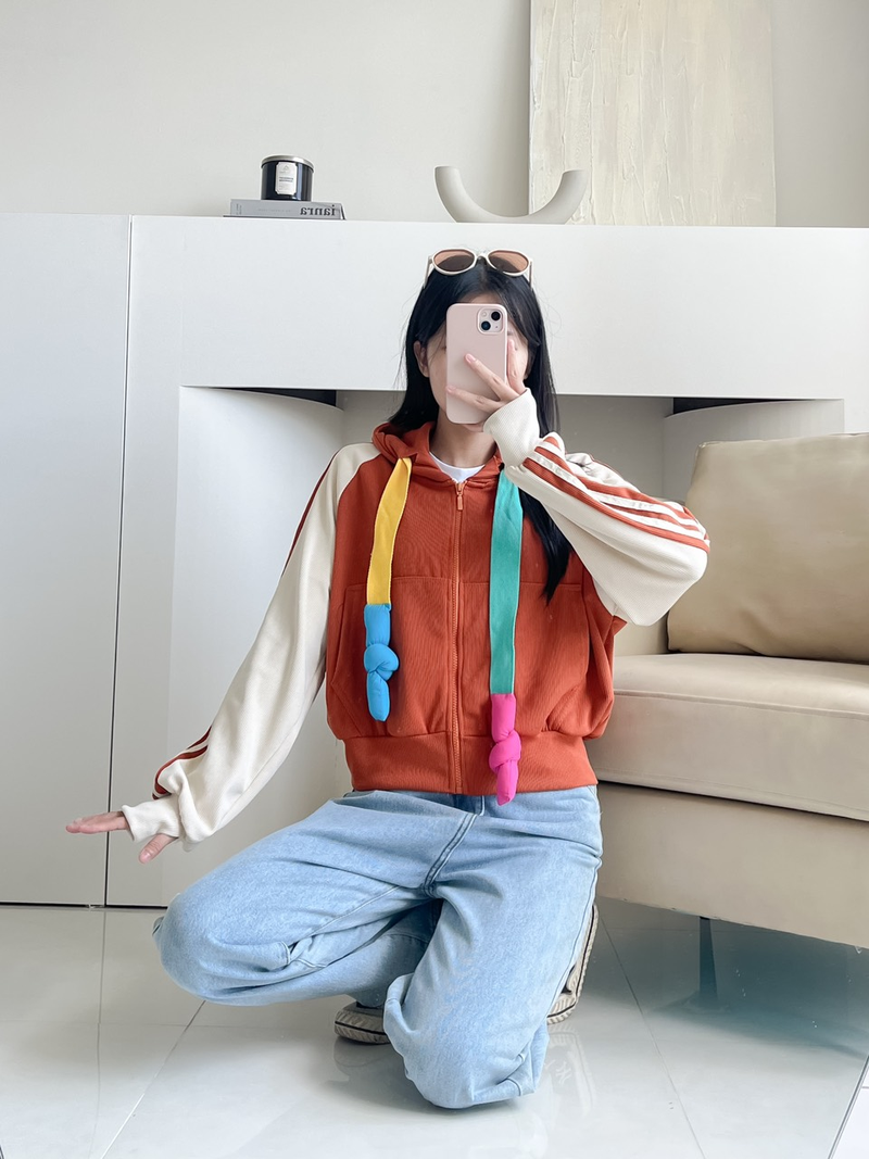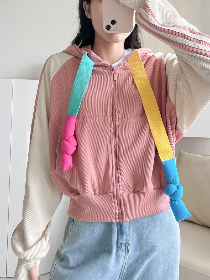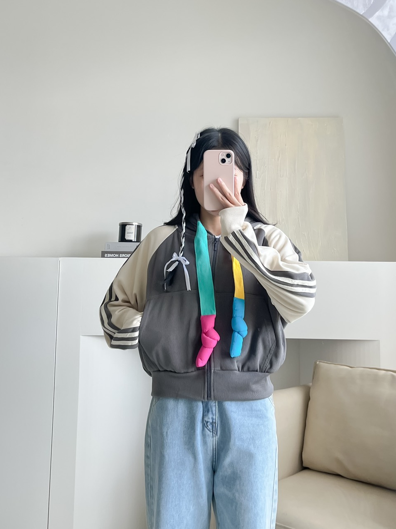Áo khoác nữ lửng viền sọc phối dây màu cầu vòng bản to