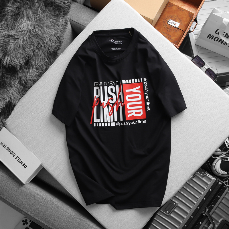 Áo Thun Nam Cổ Tròn Rurumen Màu Đen In Chữ Plus Limit Big Size