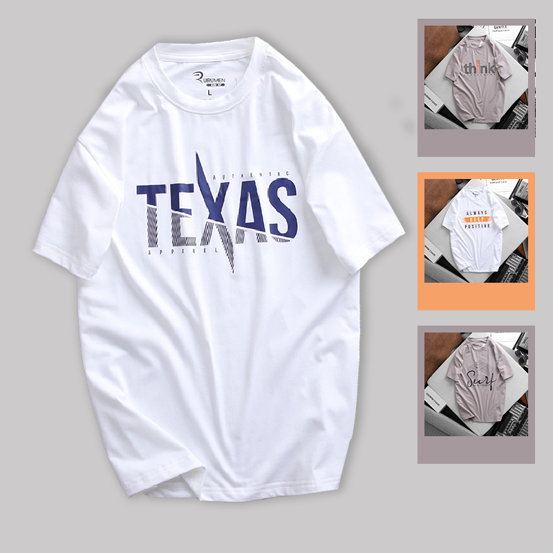 Áo Thun Nam Cổ Tròn Rurumen Màu Trắng In chữ Texas Big Size