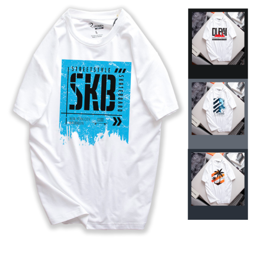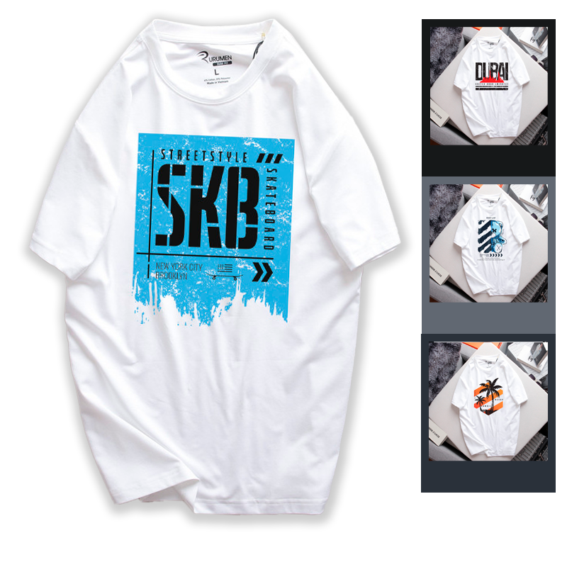 Áo thun nam cổ tròn Rurumen màu trắng in logo chữ SKB là sản phẩm phù hợp cho những chàng trai yêu thích phong cách thể thao năng động và thoải mái.