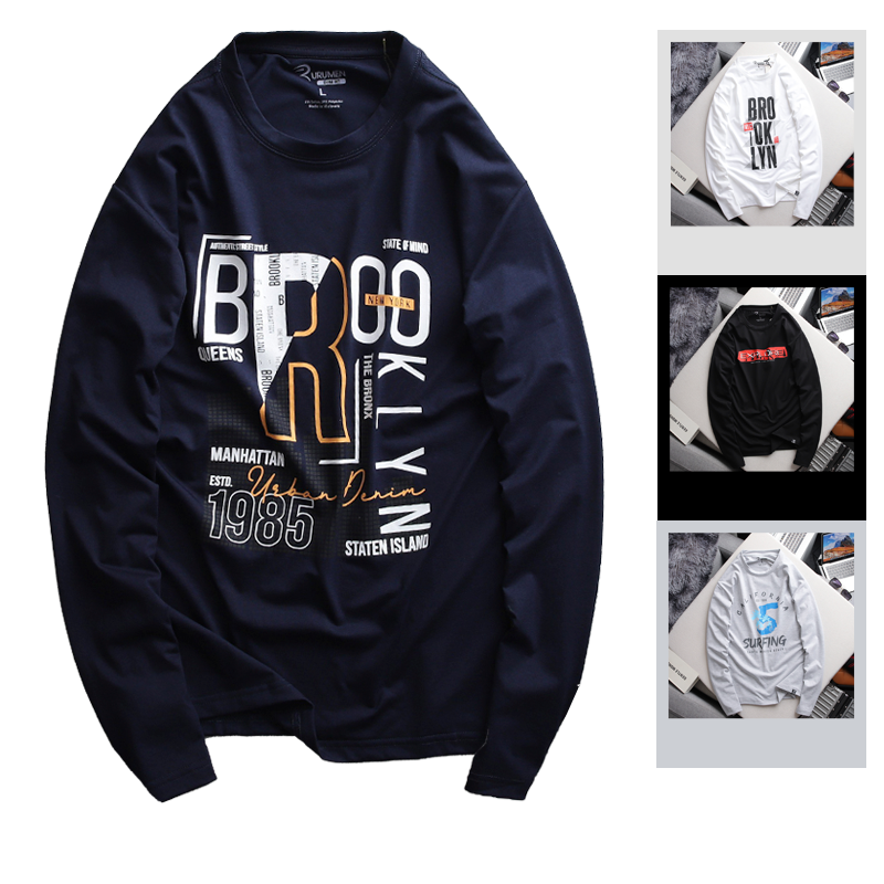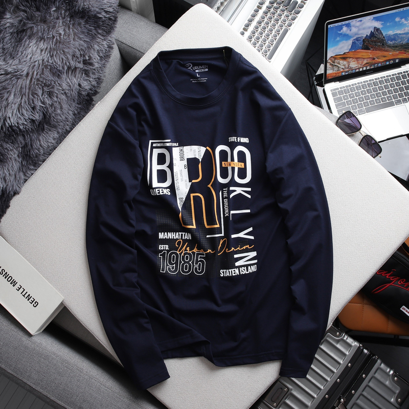 Áo Thun Nam Tay Dài Cổ Tròn Rurumen Màu Xanh Đen In Chữ BROOKLYN Big Size