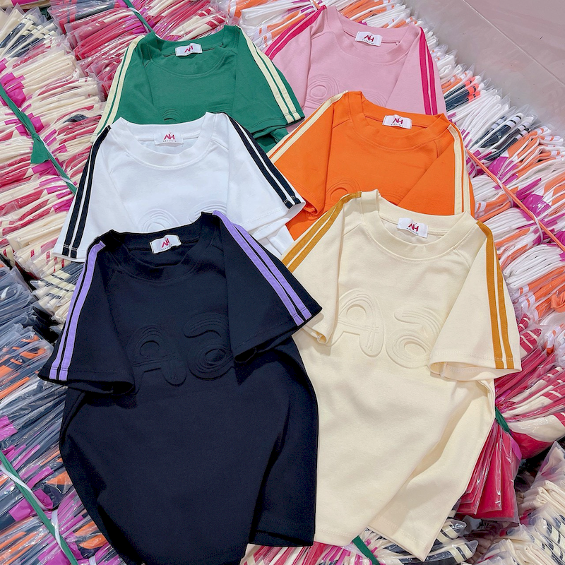 Áo Thun Nữ Cổ Tròn Baby Tee Tay Viền Sọc In Dập Nổi Chữ A Mạc AH787