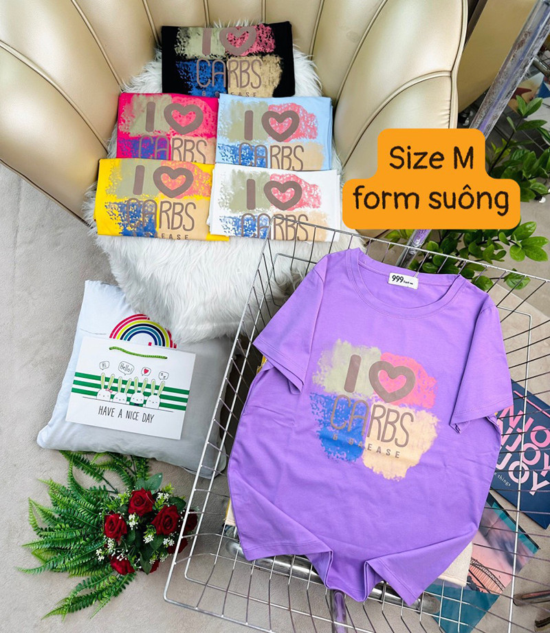 Áo Thun Nữ Cổ Tròn Form Vừa In Chữ I Love CARBS Size M(40-60kg)