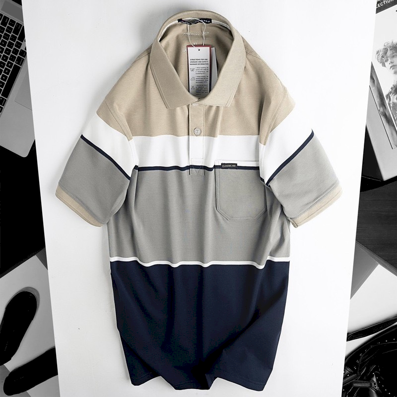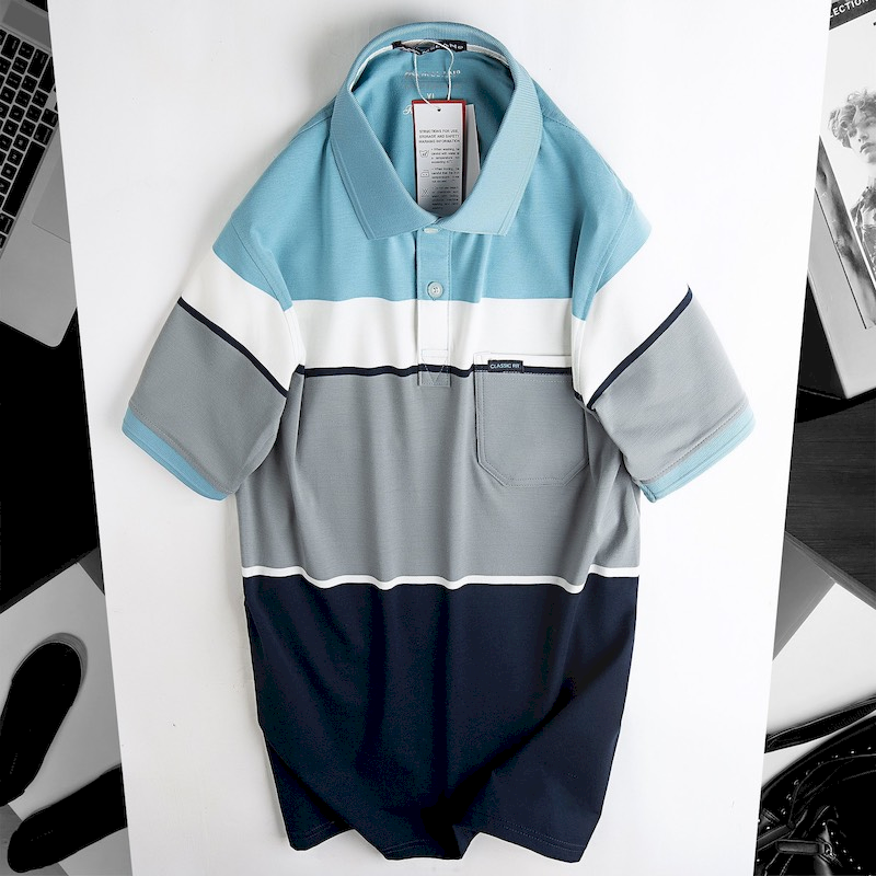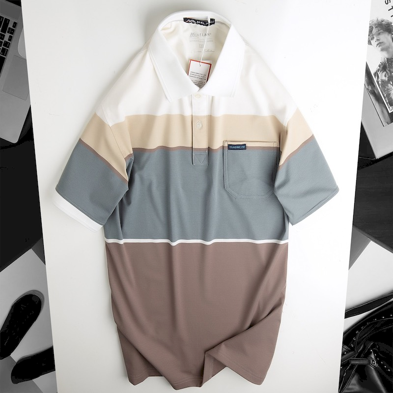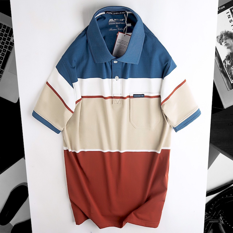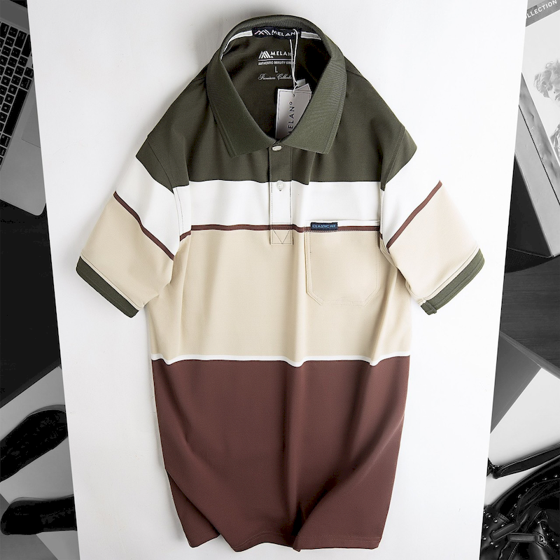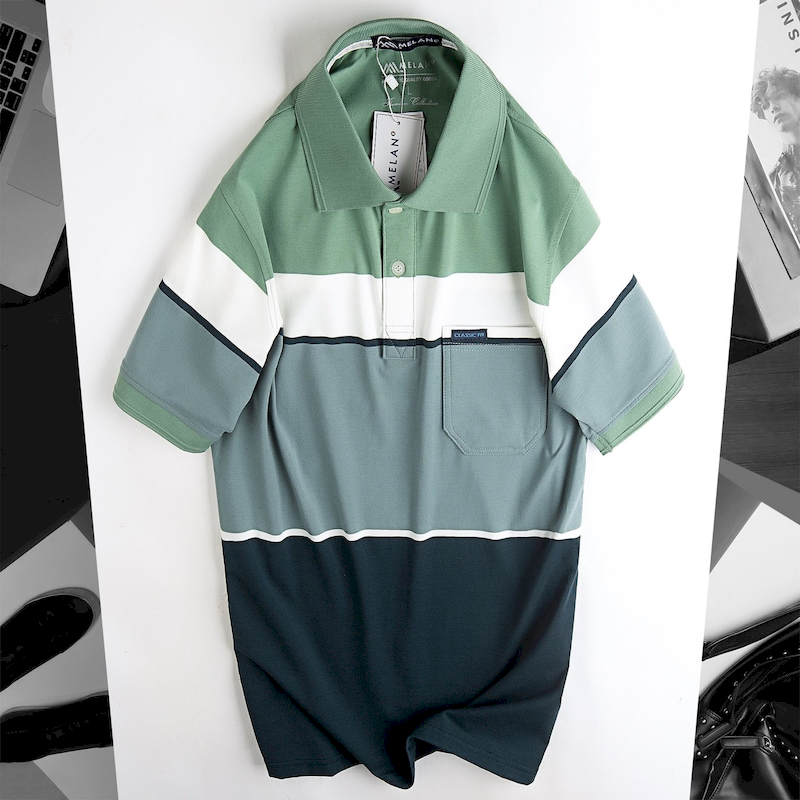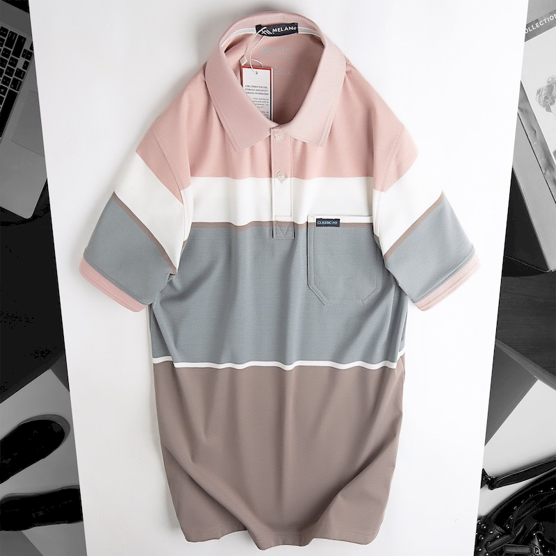 Mang phong cách trẻ trung nhưng vẫn đầy lịch lãm với Áo Thun Sọc Nam Trung Niên Phối Màu Cổ Bẻ Có Túi.