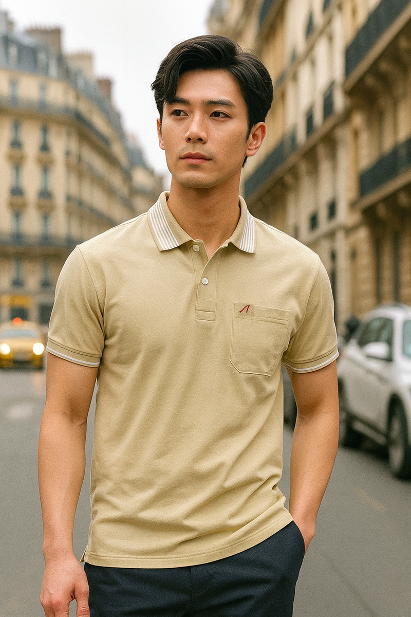 👉 Một item basic nhưng không hề đơn giản – thiết kế cổ bẻ lịch lãm, túi ngực tiện dụng, điểm nhấn logo chữ A thêu tinh tế, mang lại vẻ ngoài gọn gàng – trẻ trung – nam tính.