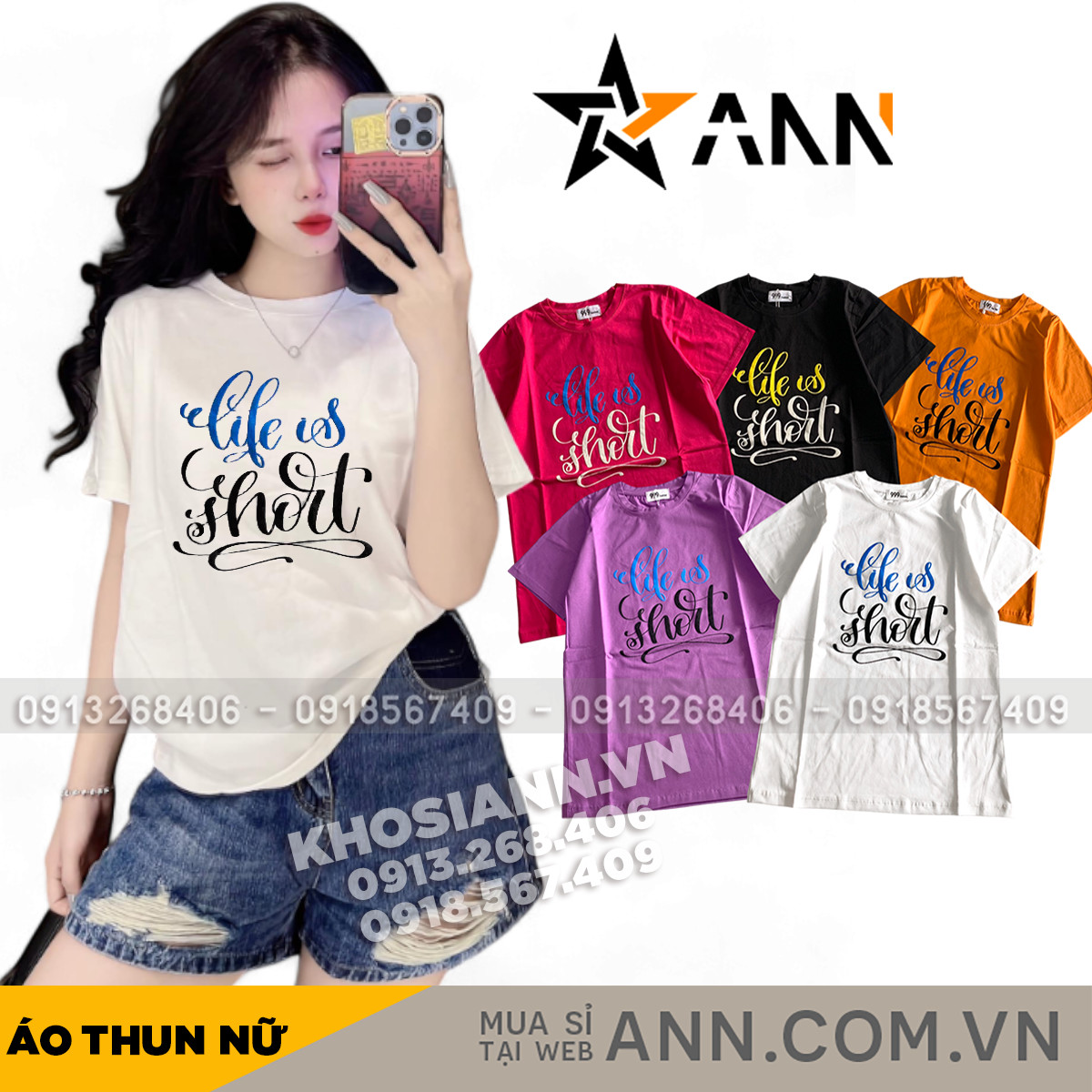Bỏ sỉ áo Thun Nữ Cổ Tròn Form Vừa In Chữ Life Is Short Size M(40-60kg)