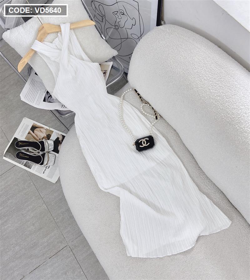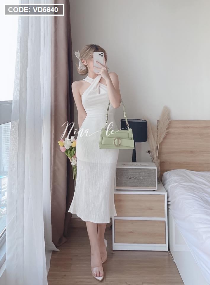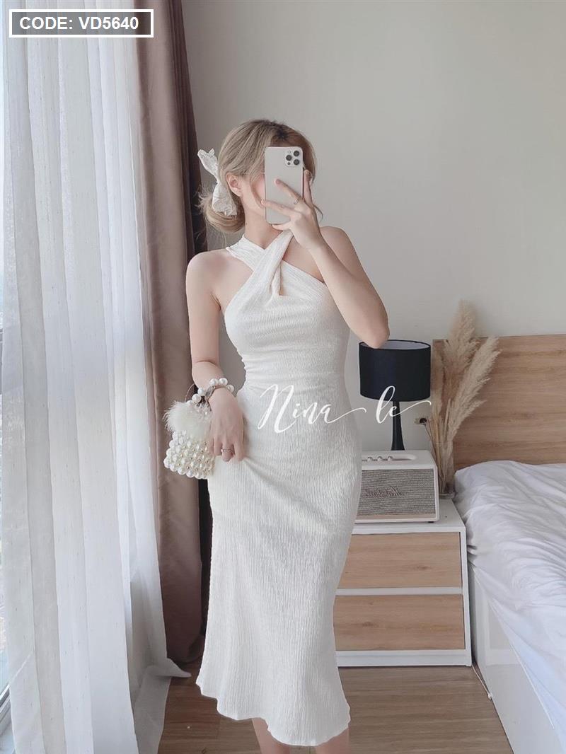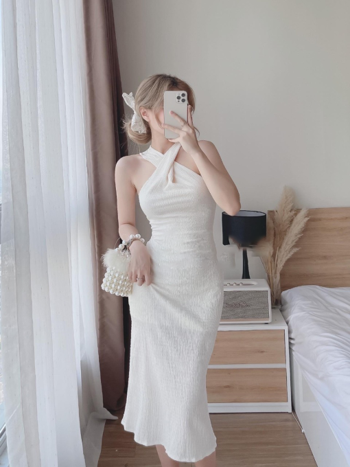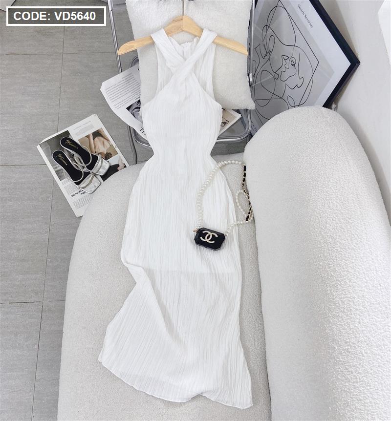 Bỏ sỉ đầm maxi trắng cổ yếm chéo