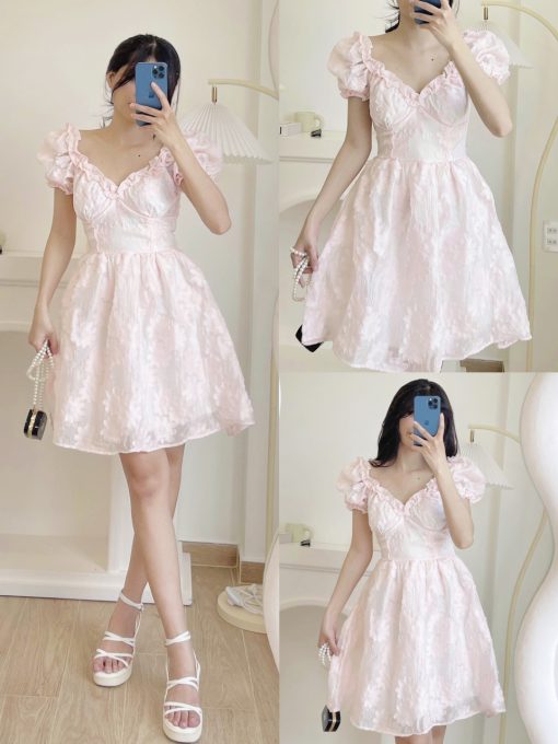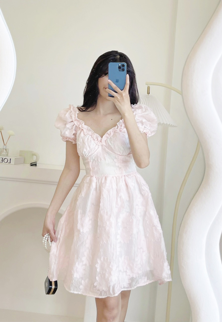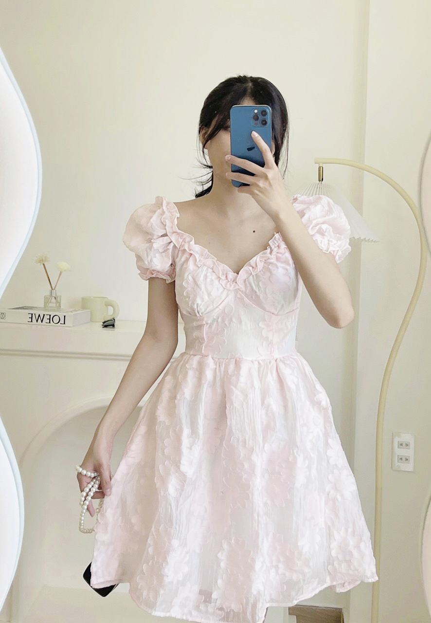 Đầm nữ hoa nổi viền ren ngực bèo hồng