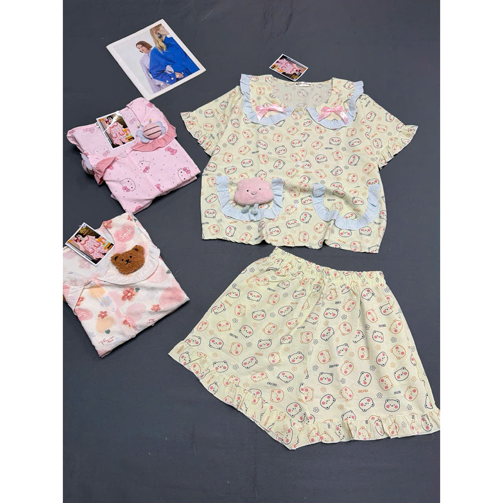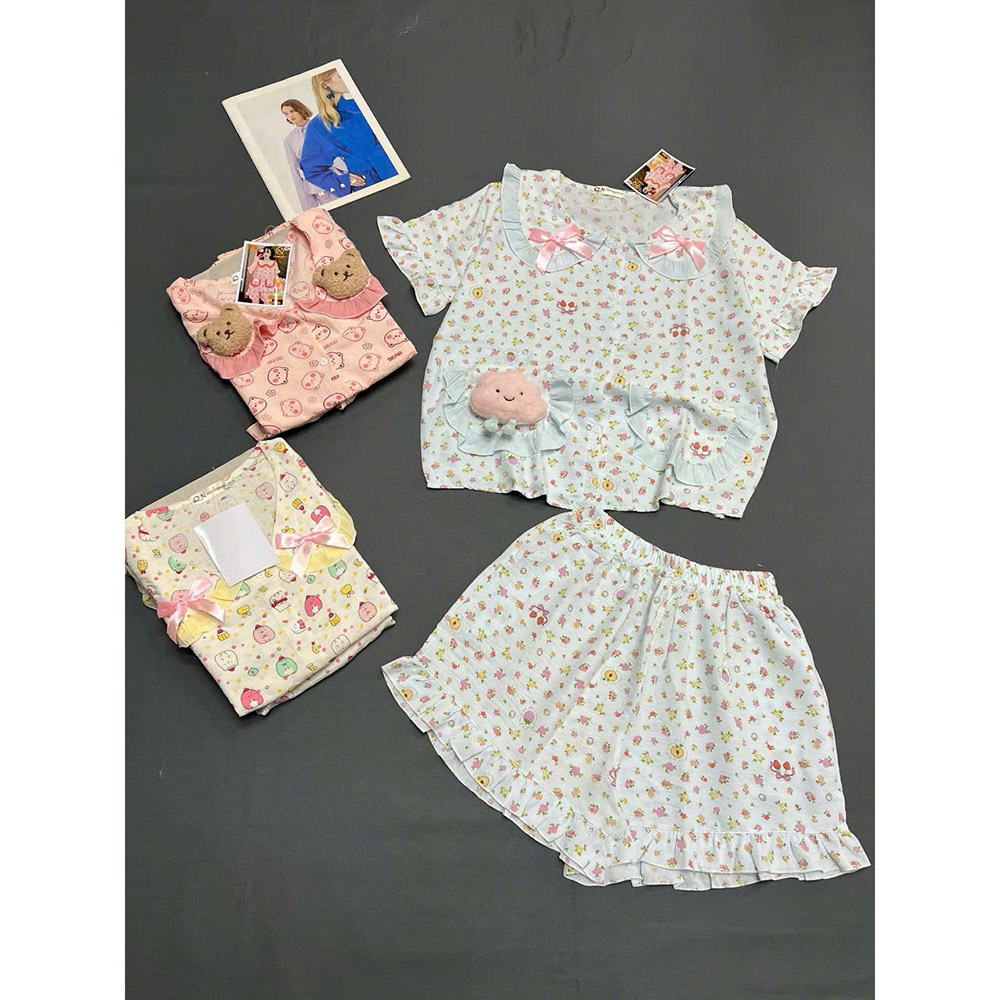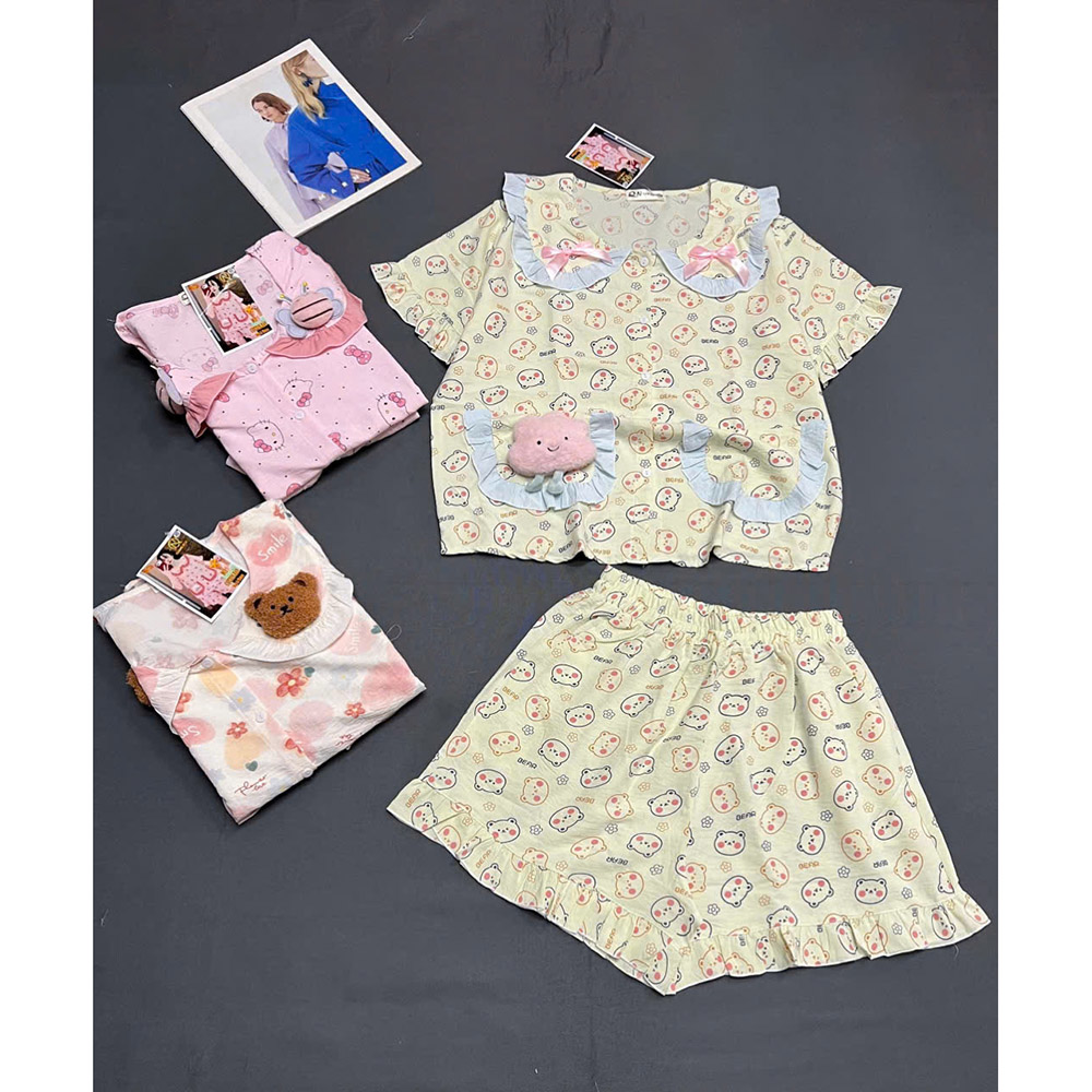 Bỏ sỉ đồ Bộ Nữ Áo Cổ Sen Tay Ngắn Quần Đùi Họa Tiết Đáng Yêu Vải Cotton Hàn Mịn Mát Size 45-62kg