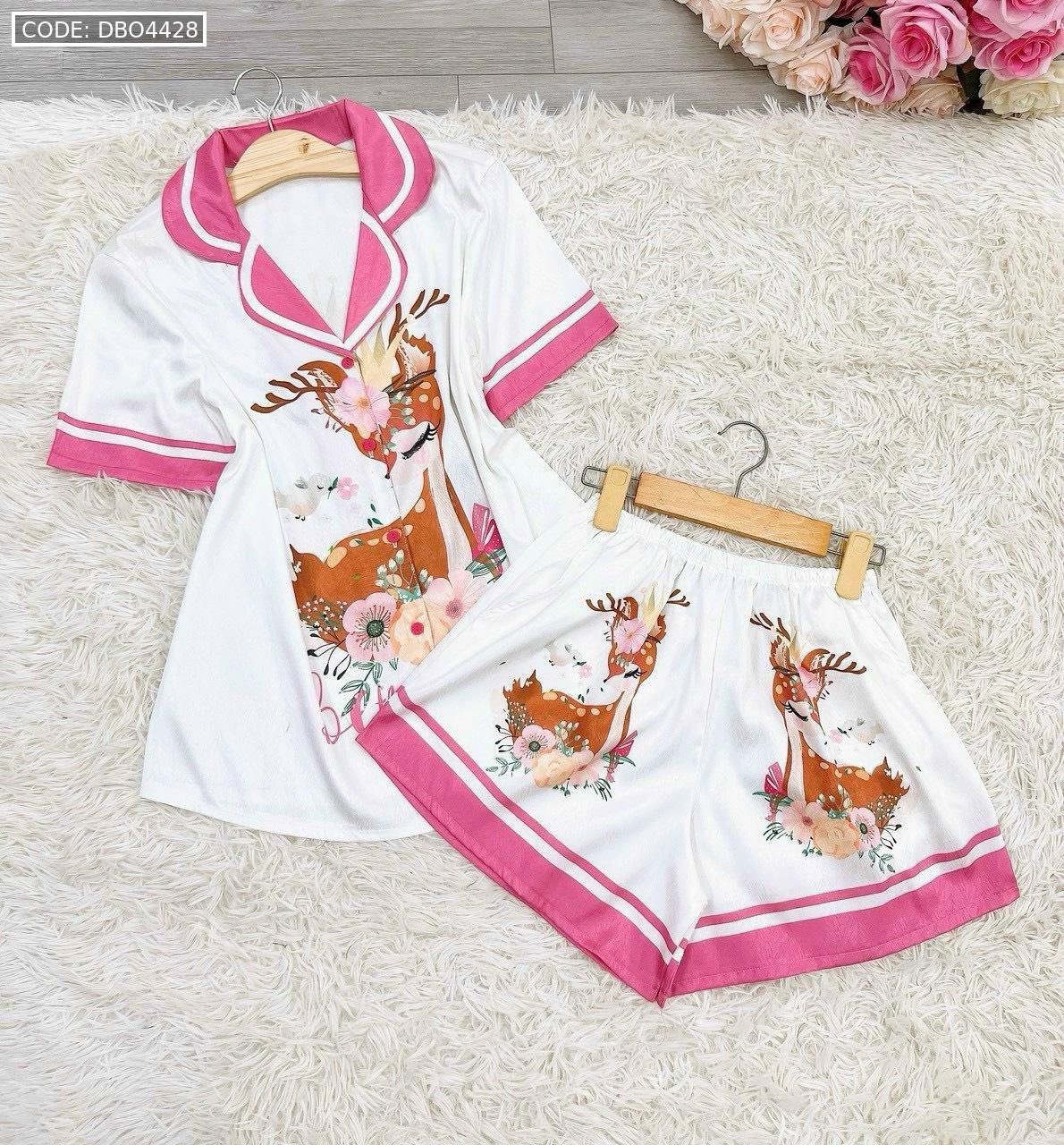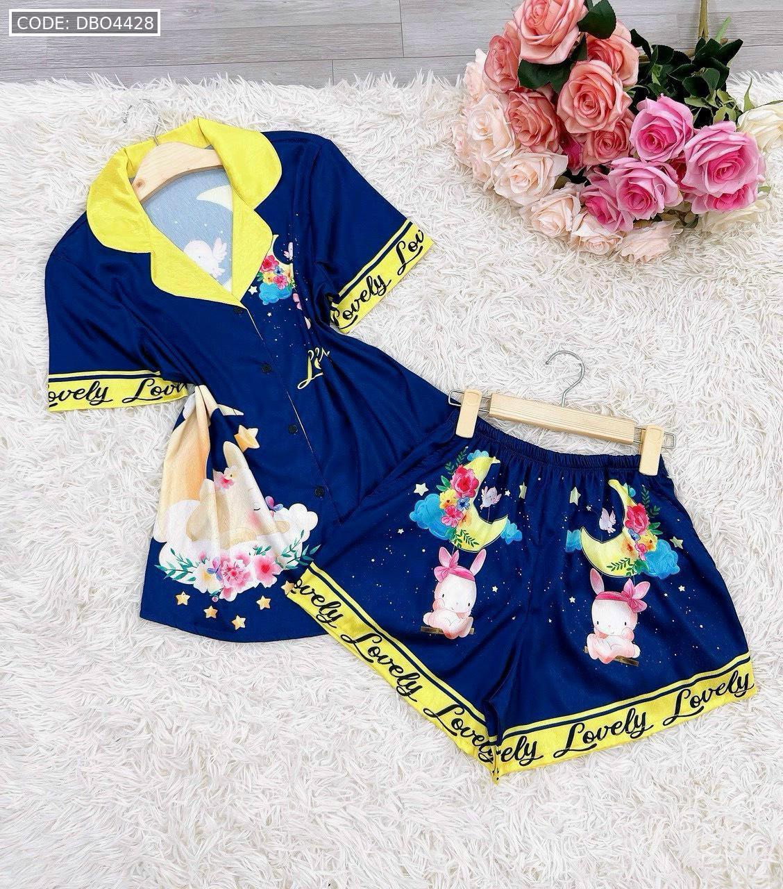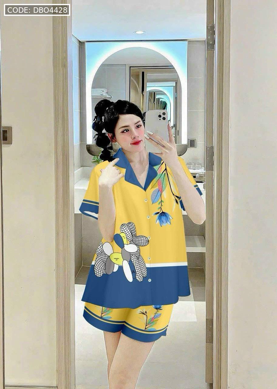 Bỏ sỉ đồ bộ satin mặc nhà quần đùi áo tay ngắn cổ bẻ in hình