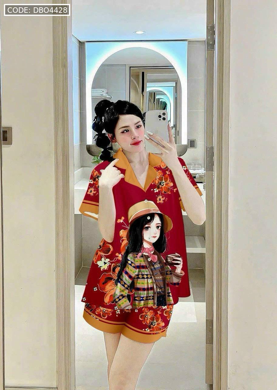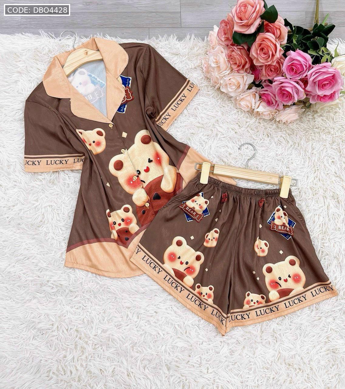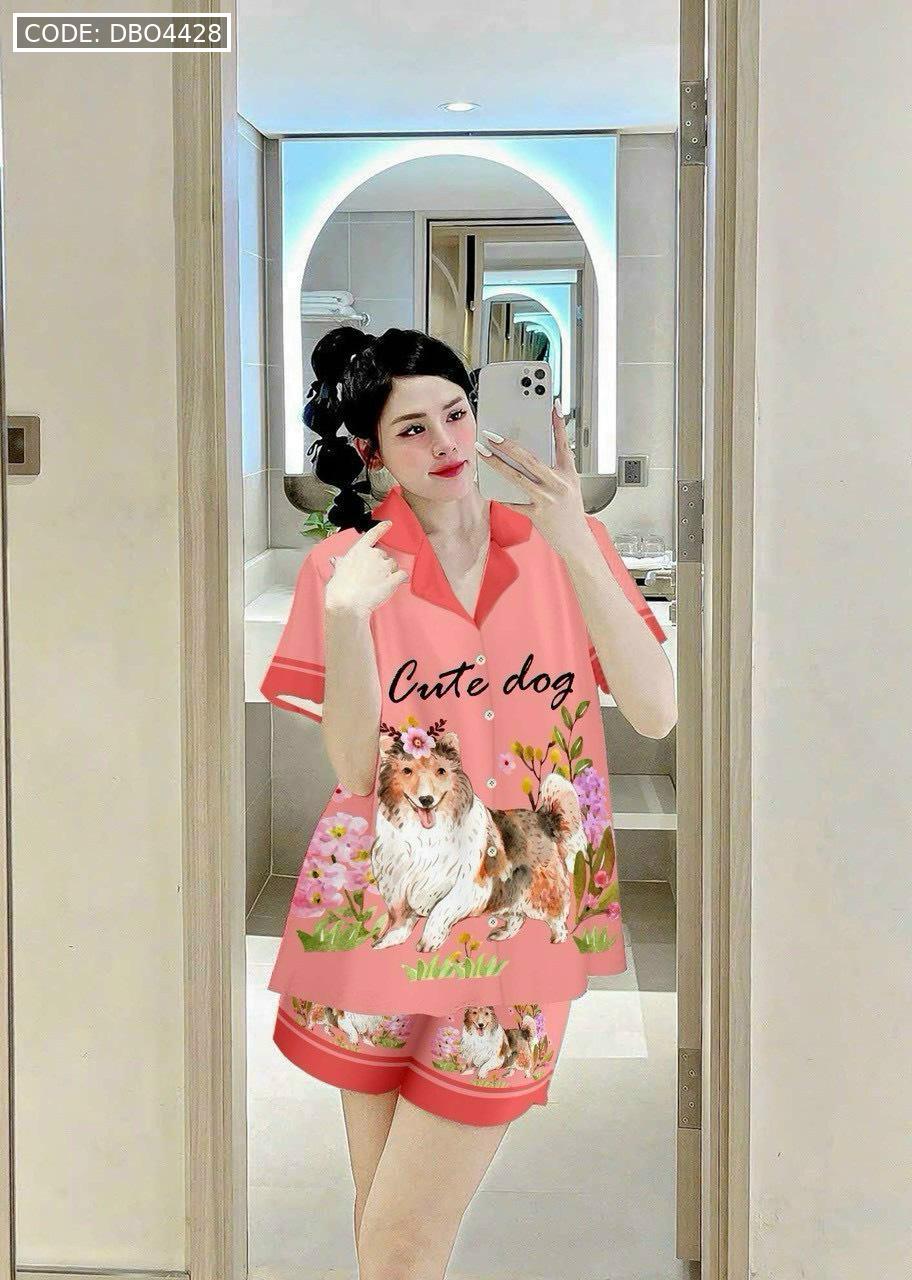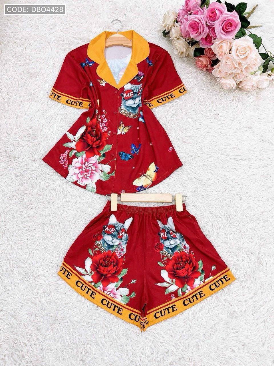 Bỏ sỉ đồ bộ satin mặc nhà quần đùi áo tay ngắn cổ bẻ in hình