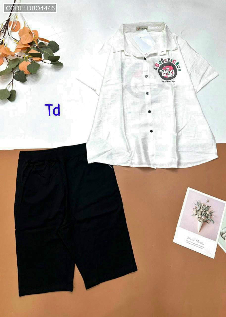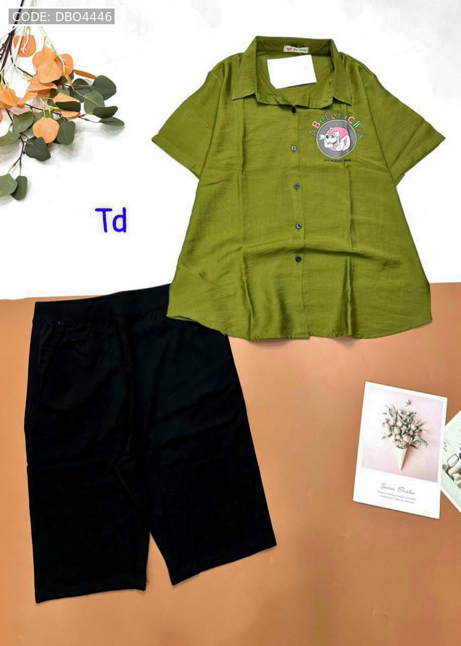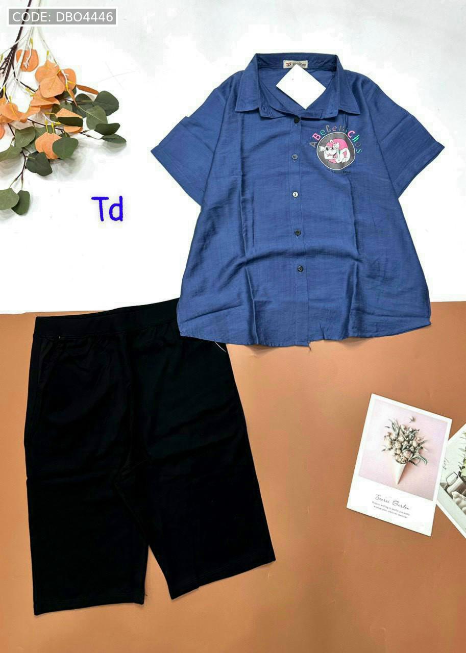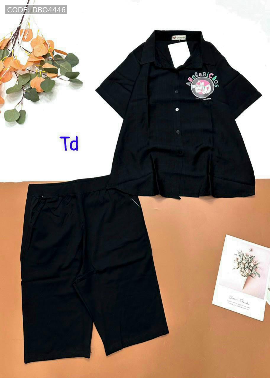 Bỏ sỉ đồ bộ tơ xước quần ngố đen áo sơ mi tay ngắn in hình bên trái