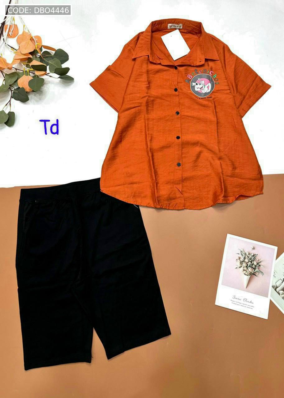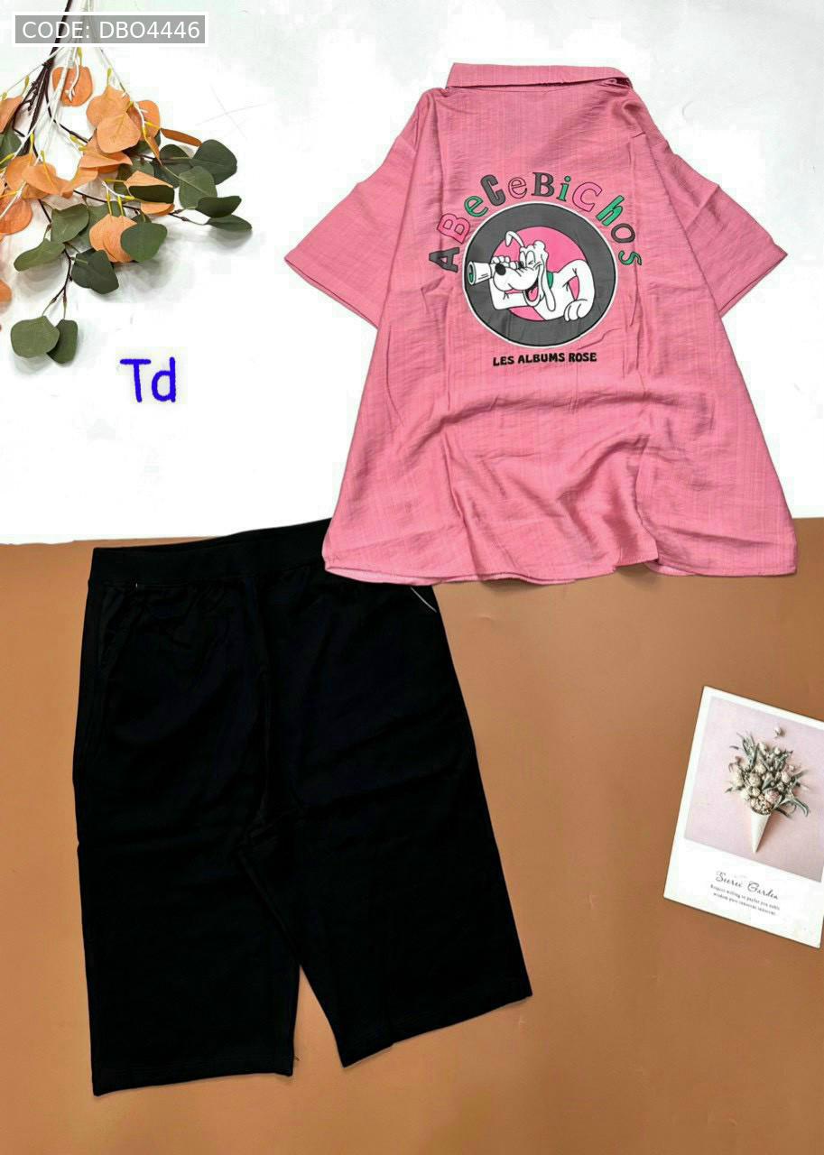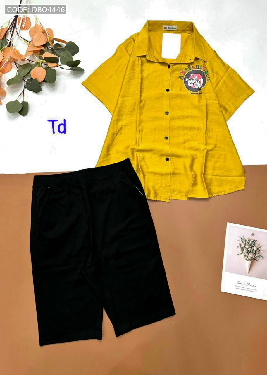 Bỏ sỉ đồ bộ tơ xước quần ngố đen áo sơ mi tay ngắn in hình bên trái