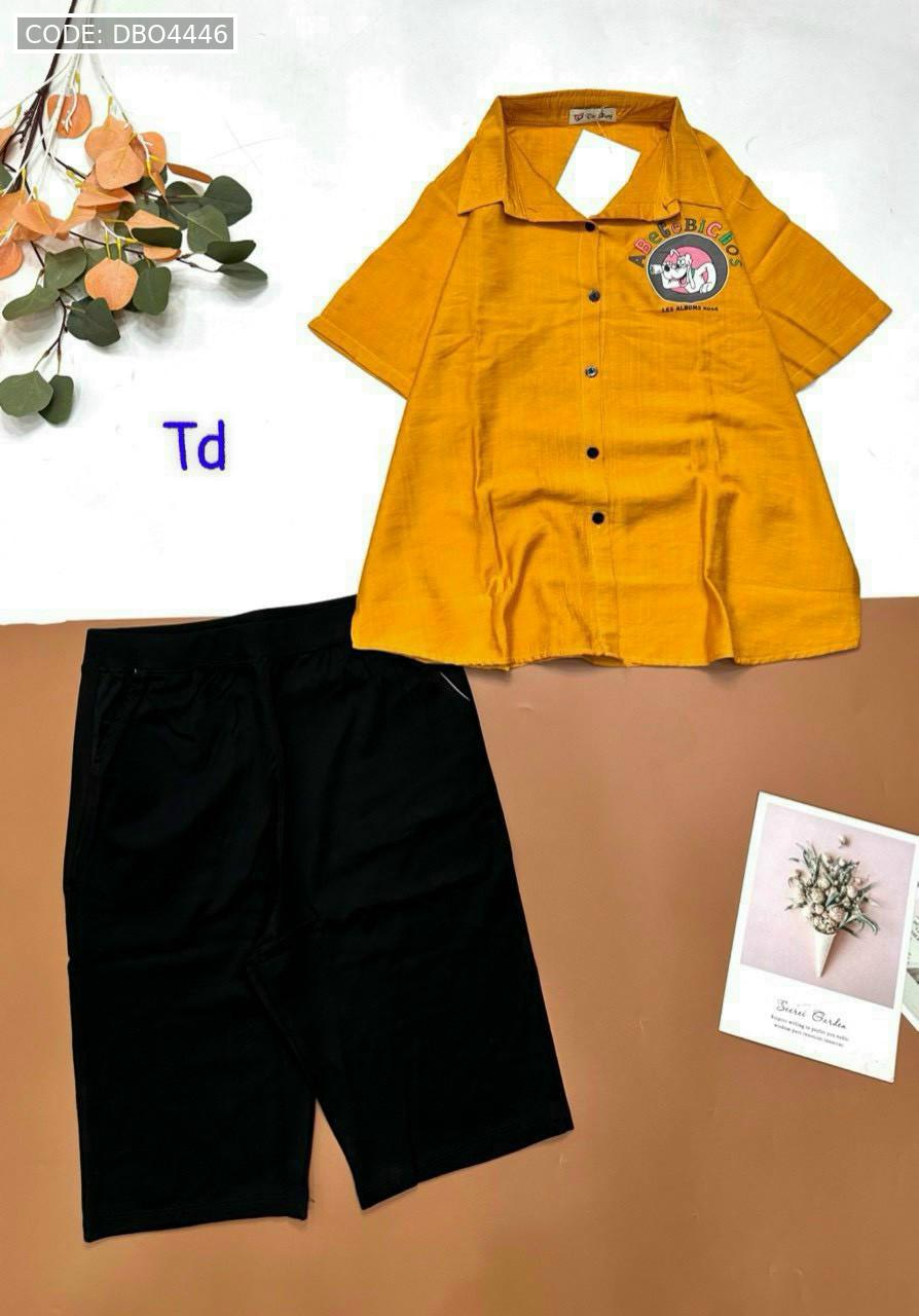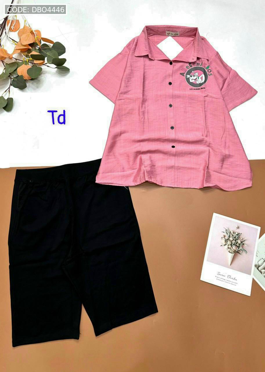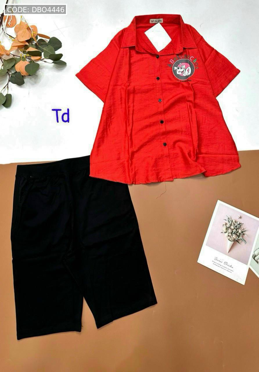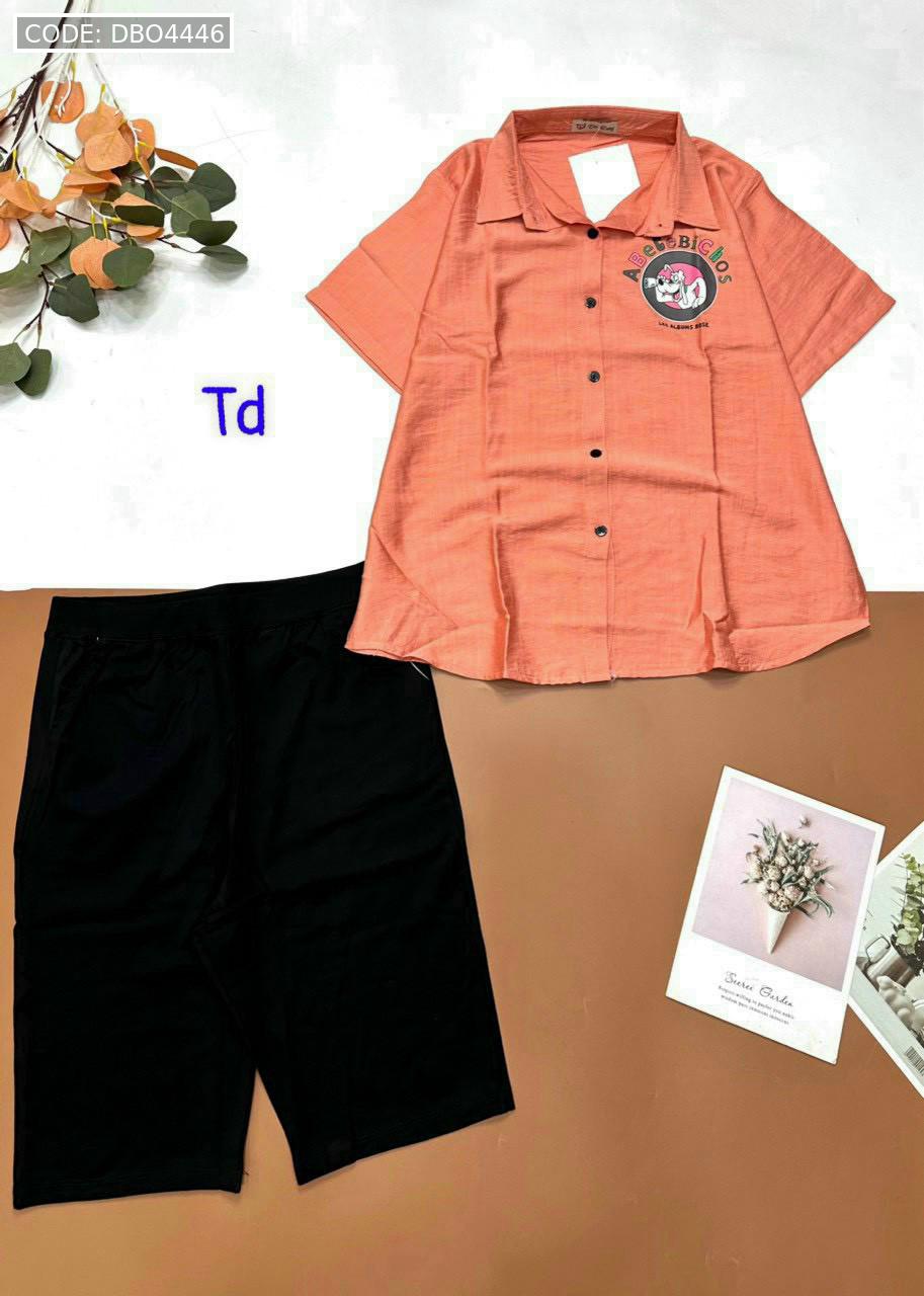 Bỏ sỉ đồ bộ tơ xước quần ngố đen áo sơ mi tay ngắn in hình bên trái