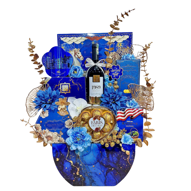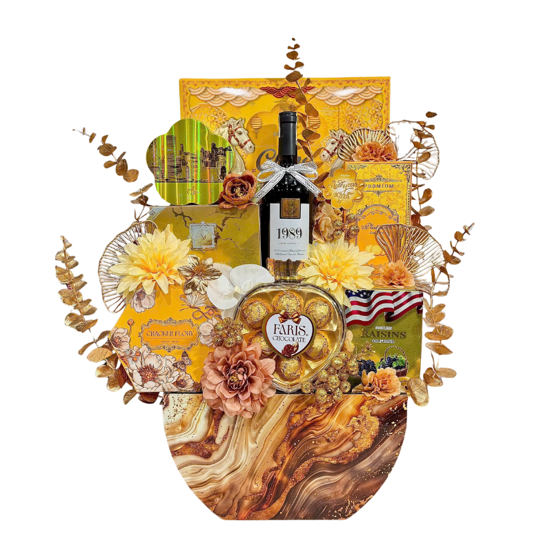 Bộ quà phiên bản Xanh – Đỏ – Vàng được thiết kế nổi bật với họa tiết hoa, khay trứng vàng và rượu vang 1989 ở vị trí trung tâm, tạo nên tổng thể vừa ấm áp, may mắn vừa cực kỳ sang trọng khi biếu Tết.