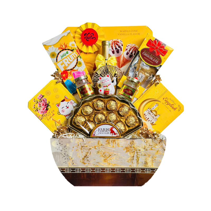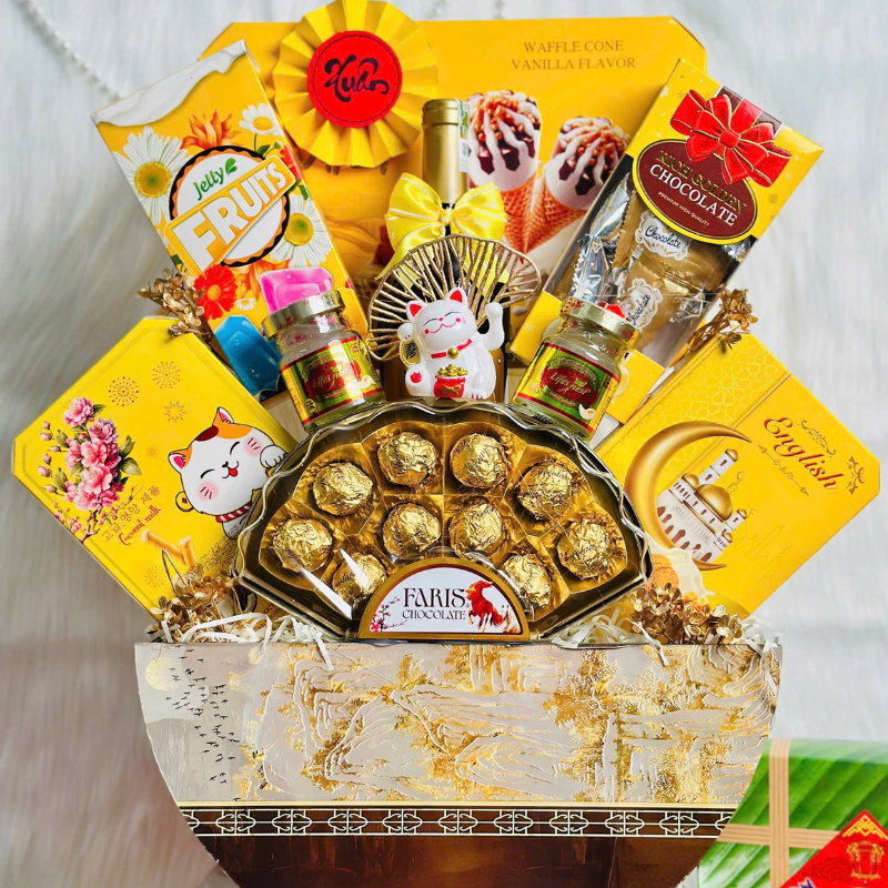 Từng giỏ được trang trí tỉ mỉ, phụ kiện đồng bộ màu, form cứng cáp, bố cục đầy đặn – trưng ở phòng khách hay bàn lễ đều rất nổi bật. Bên trong là các sản phẩm được chọn kỹ, bao bì đẹp, date mới, phù hợp biếu tặng cho mọi đối tượng: người thân – bạn bè – đối tác – khách hàng – thầy cô.