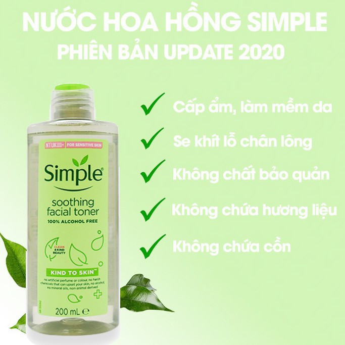 Nước Hoa Hồng Simple Dành Cho Da Nhạy Cảm Kind to Skin Soothing Facial Toner 200ml đến từ thương hiệu chăm sóc da Simple xuất xứ Anh Quốc là sản phẩm Toner không chứa cồn được thiết kế phù hợp cho làn da nhạy cảm và dễ nổi mụn, giúp làm sạch sâu và cân bằng độ pH, cung cấp độ ẩm dịu nhẹ cho làn da, mang lại cảm giác tươi mát và sảng khoái sau khi sử dụng.