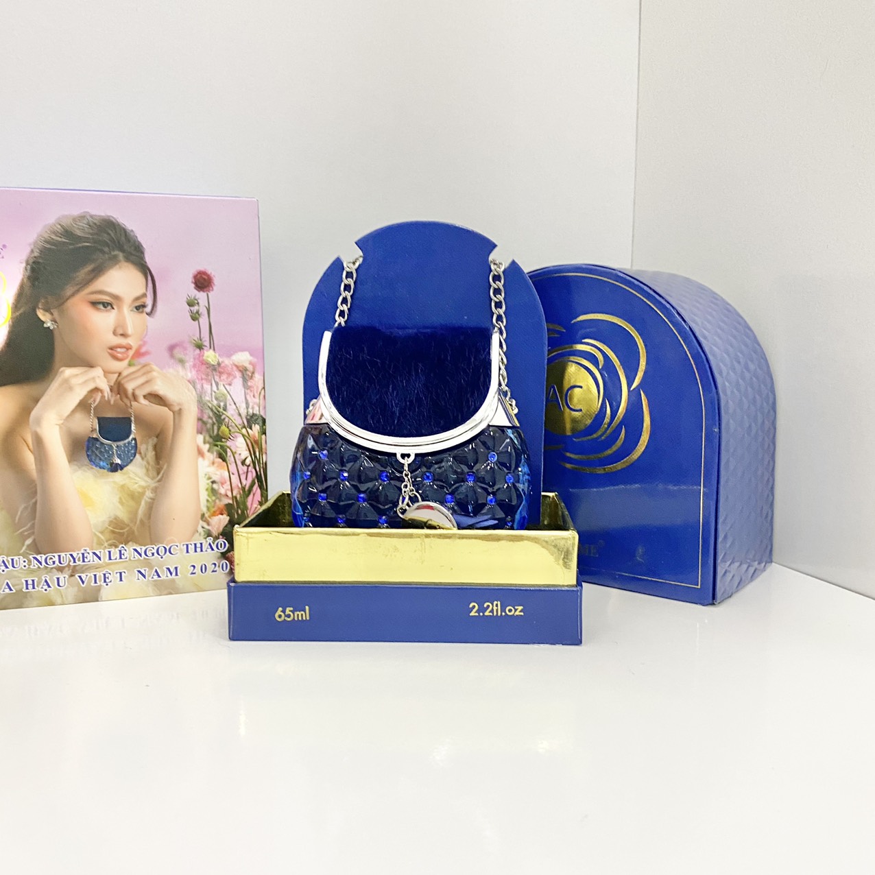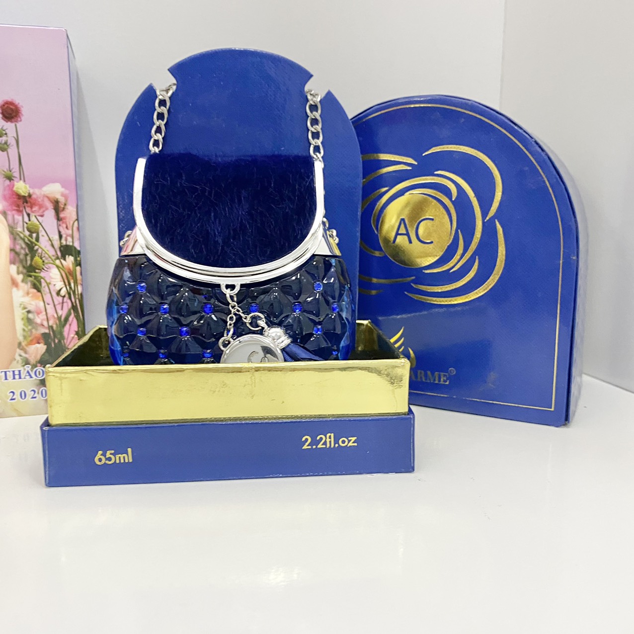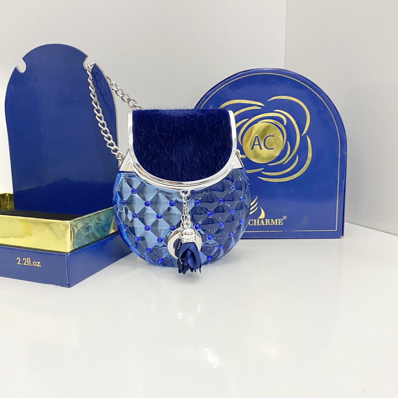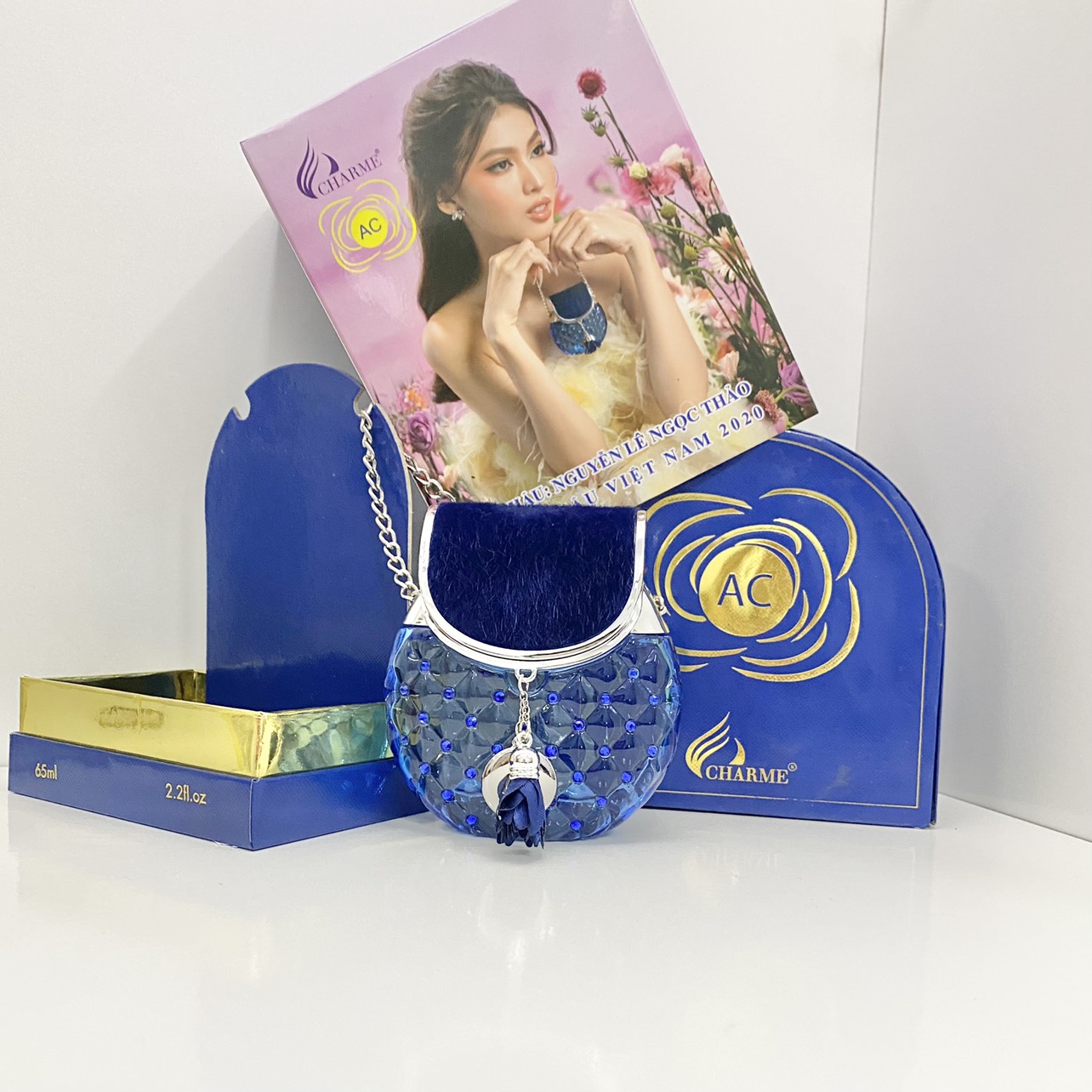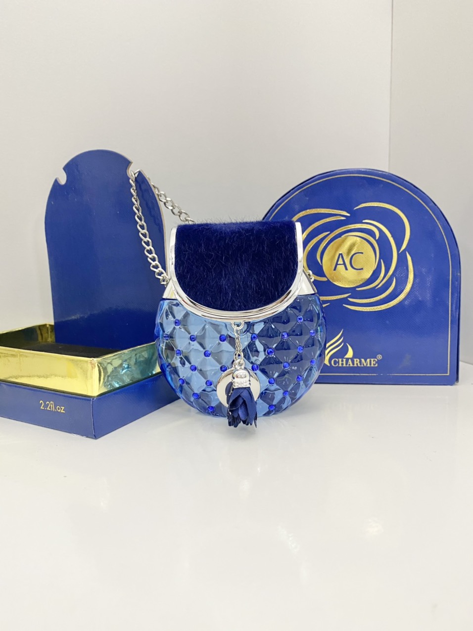 Nước Hoa Charme AC 65ml xuất hiện với thân chai màu xanh biếc được đính điểm xuyết thêm tag tên sản phẩm & hoa xanh rất riêng biệt độc đáo. Trên thân chai được đính thêm những viên pha lê đá tạo nên khối hoạ tiết hình lập thể trong suốt. Phần nắp đậy với lớp nhung mềm màu xanh kết hợp với dây xách bạc lấp lánh tạo nên vẻ sang trọng và thời thượng.