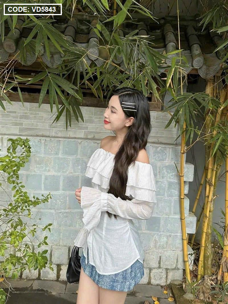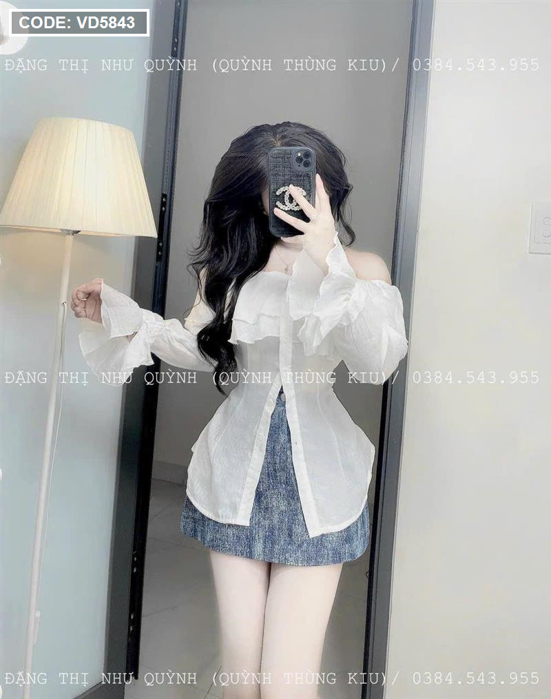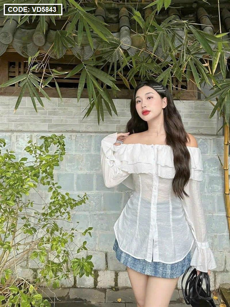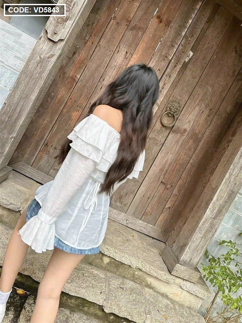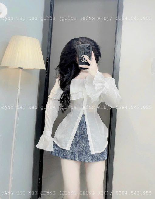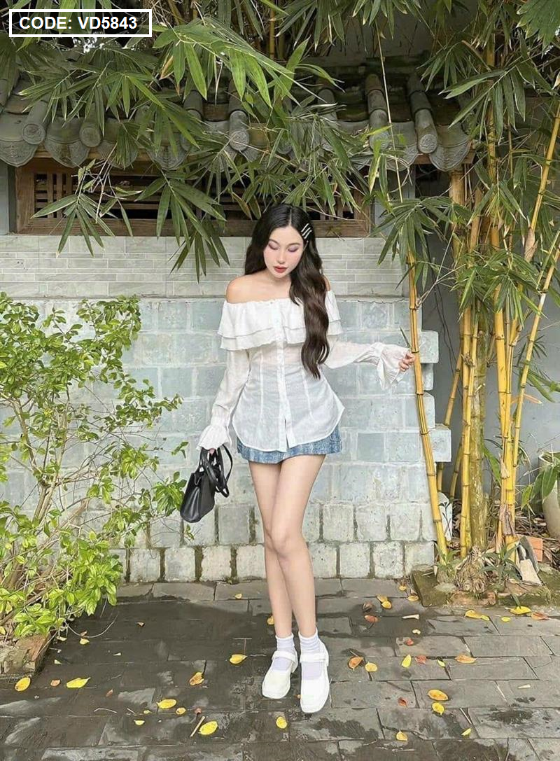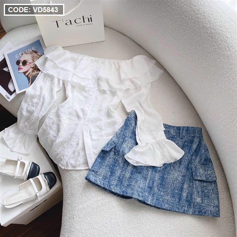 Bỏ sỉ sét áo trắng trễ vai tay loe + chân váy jean túi hộp