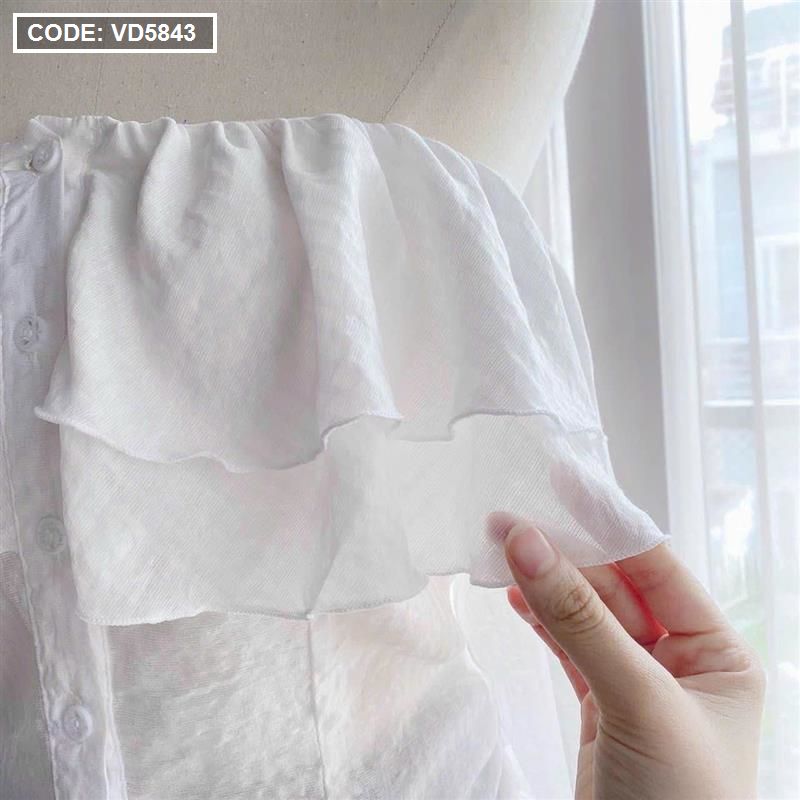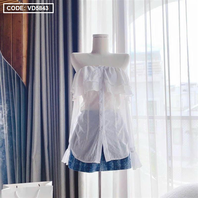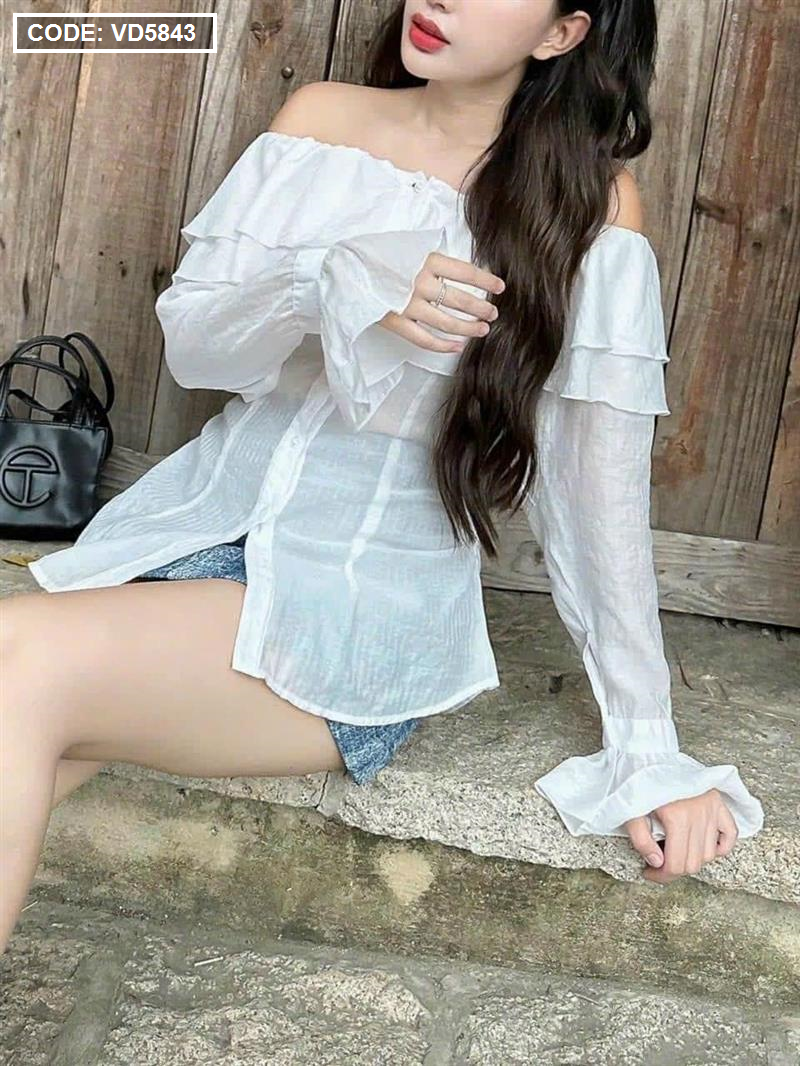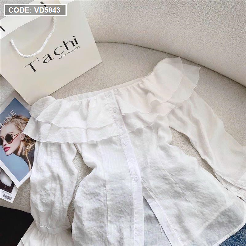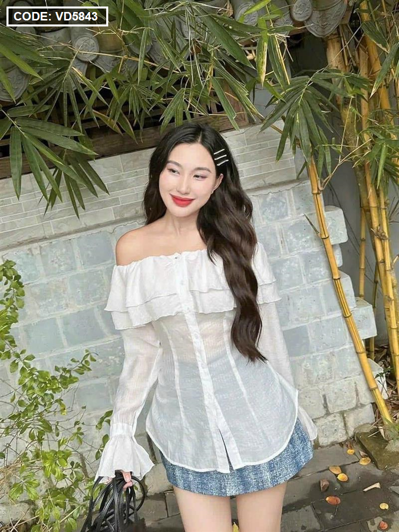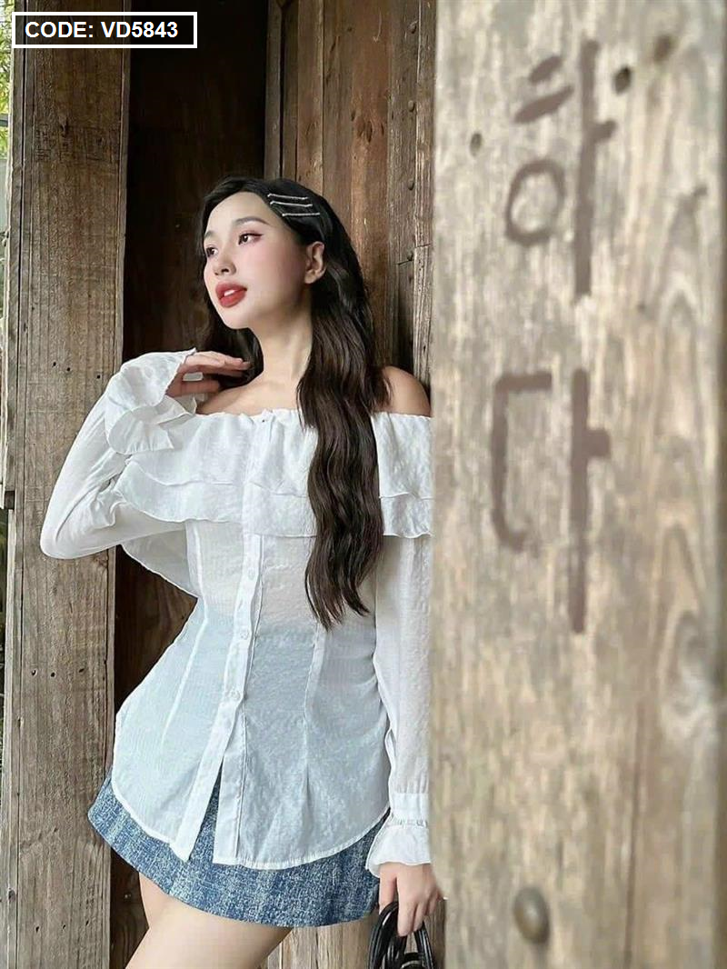 Bỏ sỉ sét áo trắng trễ vai tay loe + chân váy jean túi hộp