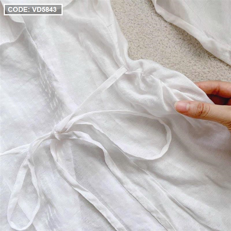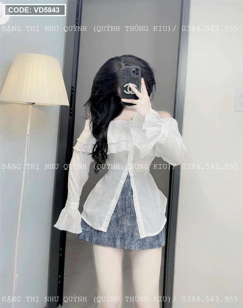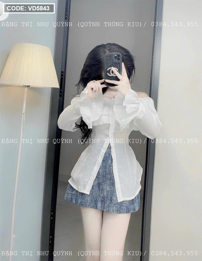 Sét áo trắng trễ vai tay loe + chân váy jean túi hộp