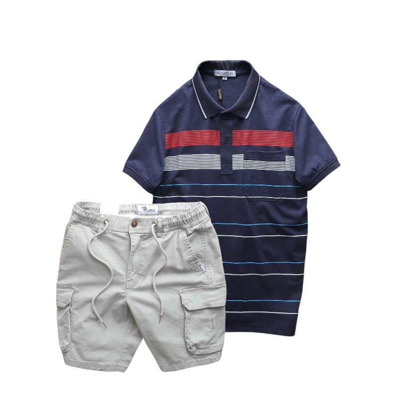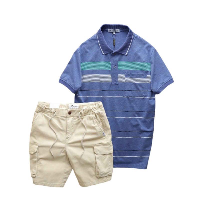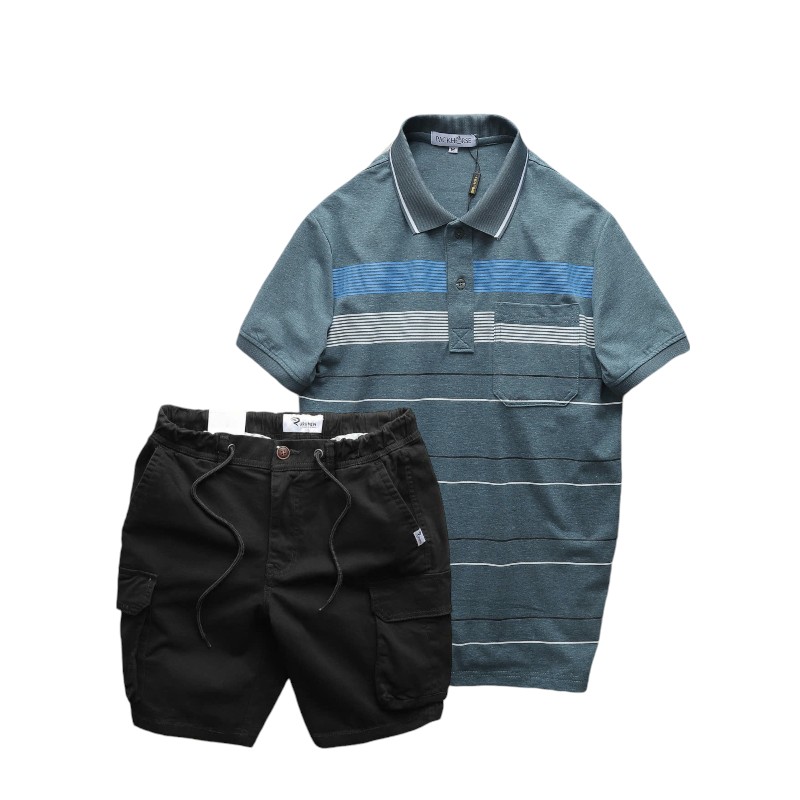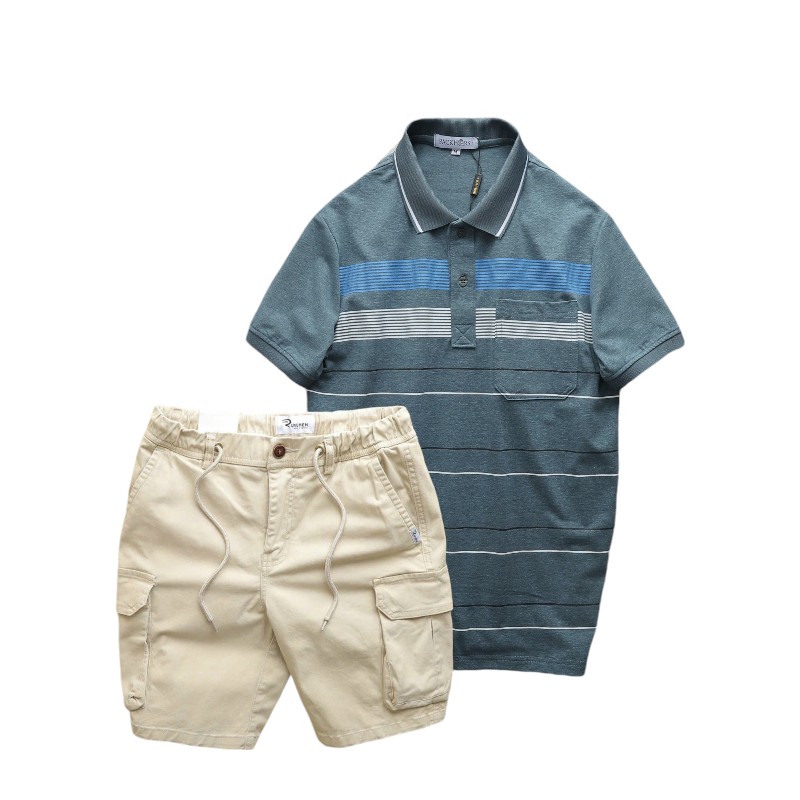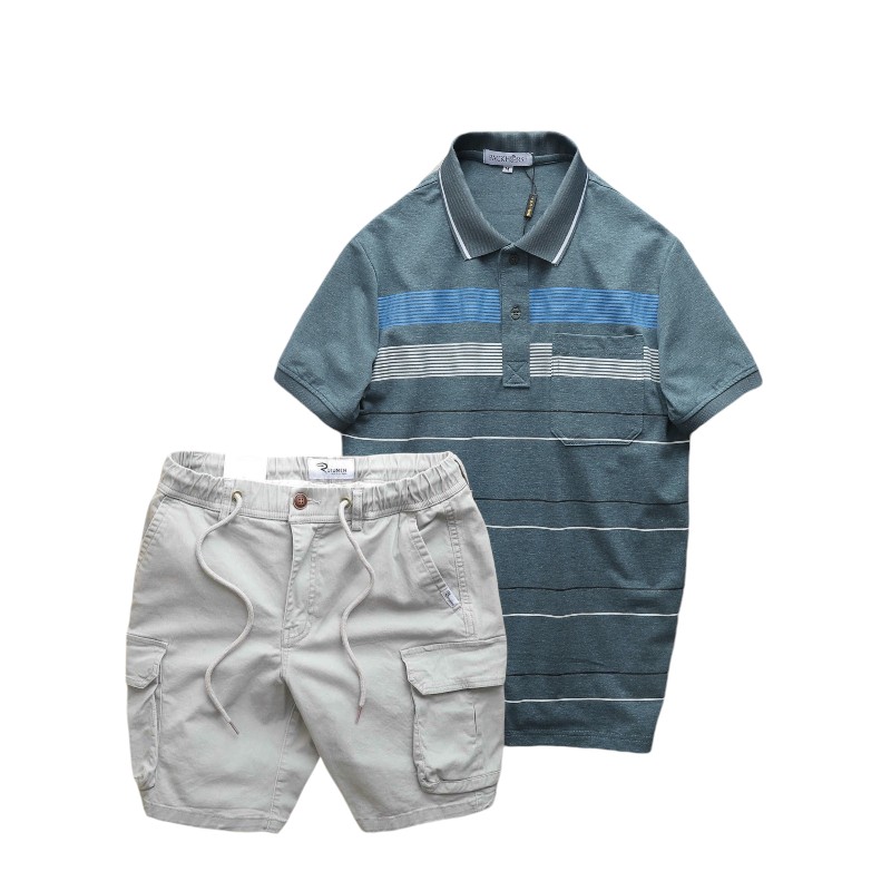 Set Bộ Nam Áo Thun Polo Hoạ Tiết Sọc Ngang Có Túi Quần Short Kaki Túi Hộp