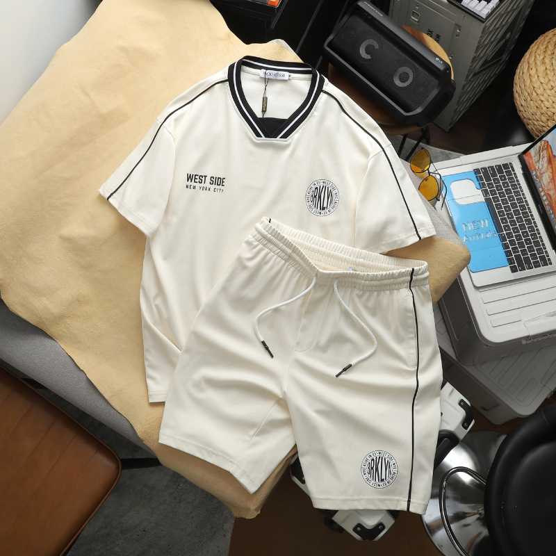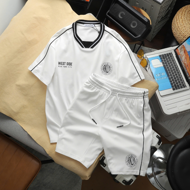 Bỏ sỉ set Bộ Nam – Set Bộ Áo Thun Nam Cổ Tròn In Logo Trước Ngực & Quần Short Phối Sọc Đen Trẻ Trung Bigsize