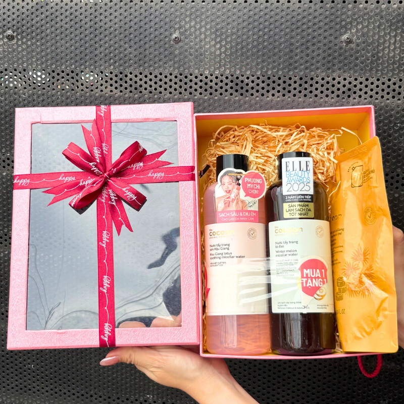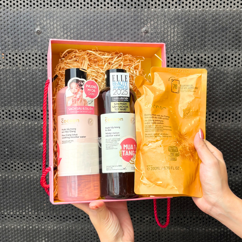 Bỏ sỉ set Quà Tặng Nước Tẩy Trang Sen Hậu Giang 500ml & Nước Tẩy Trang Bí Đao Cocoon 500ml & Tẩy Tế Bào Chết Body Đường Thốt Nốt An Giang 200ml