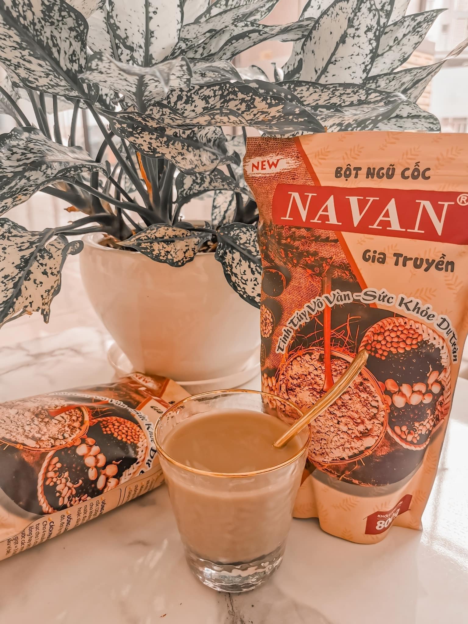+Chuẩn bị 1 ly nước ấm khoảng 200ml 40-50°C, cho 3 muỗng bột ngũ cốc Navan vào và khuấy đều. Có thể pha thêm sữa đặc hoặc đường để uống thơm ngon hơn nhé, độ ngọt tùy vào khẩu vị của mỗi người. Có thể bỏ thêm đá vào để uống ngon hơn. Khuấy đều trước mỗi lần uống.