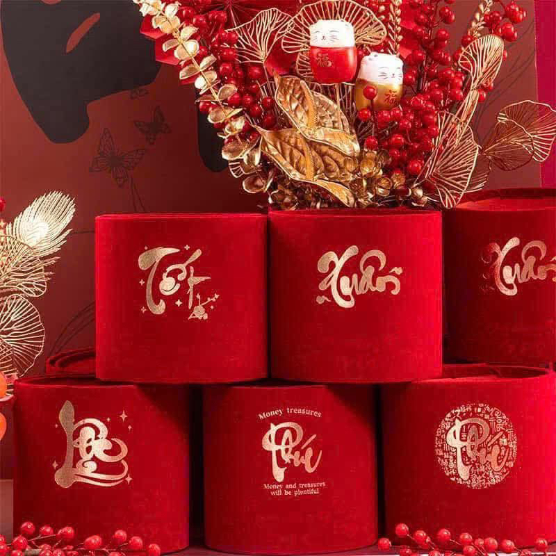 Trụ nhung đỏ là một trong những phụ kiện trang trí Tết bán chạy nhất vì độ sang trọng và tính ứng dụng cực cao. Màu đỏ nhung nổi bật, kết hợp họa tiết thư pháp ánh vàng tạo cảm giác ấm áp – may mắn – tràn đầy tài lộc khi bước vào năm mới