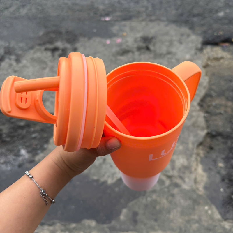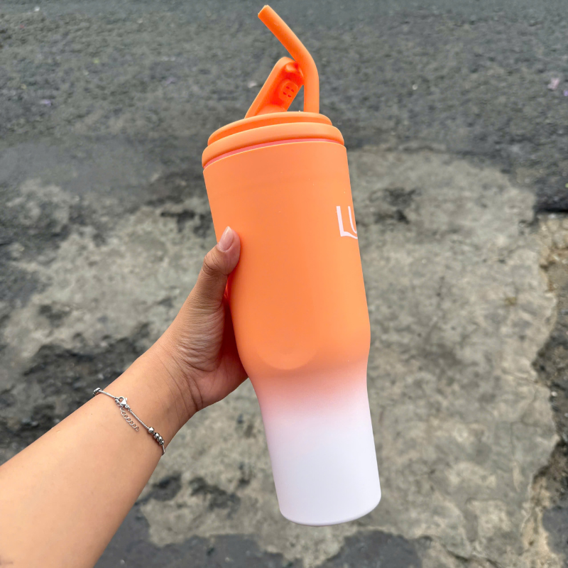 Bình màu cam nổi bật, thân chuyển màu đẹp mắt, có ống hút và quai cầm tiện lợi, phù hợp mang theo mỗi ngày.