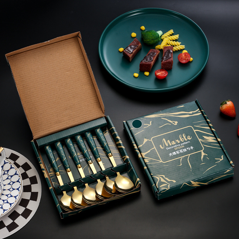 Bộ 6 Muỗng Inox 304 Cao Cấp Thìa Inox Vân Đá Tráng Vàng Kèm Hộp 16x18cm