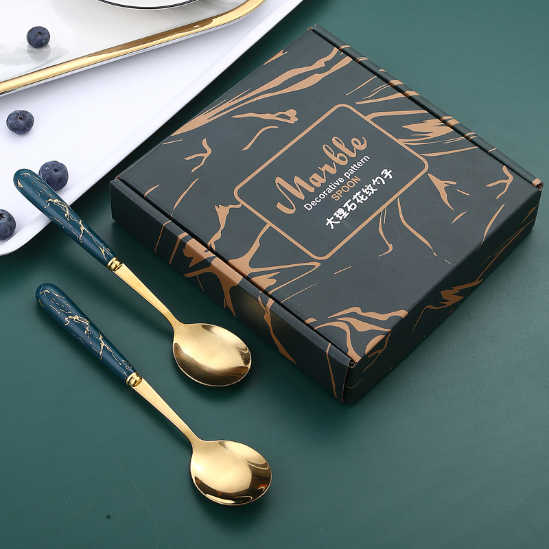 Chuyên sỉ bộ 6 Muỗng Inox 304 Vân Đá Tráng Vàng Kèm Hộp 16x18cm