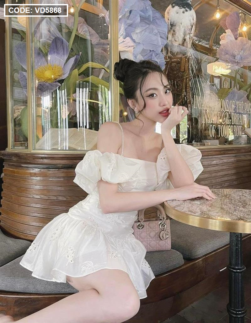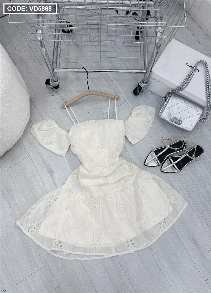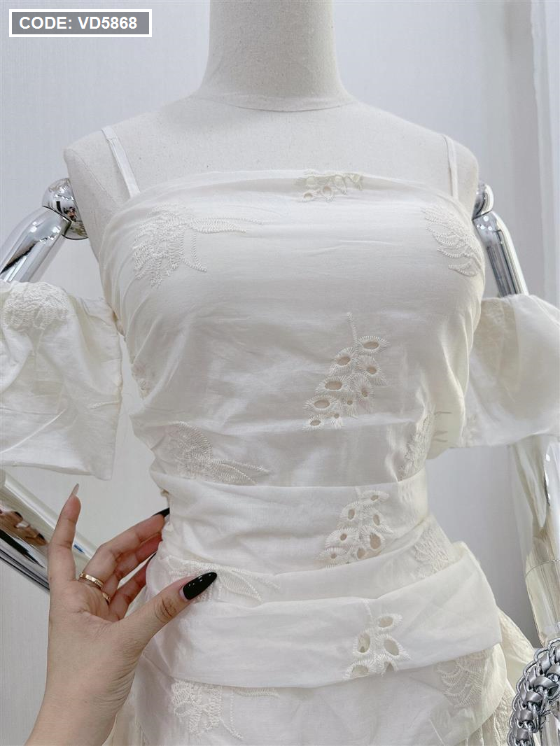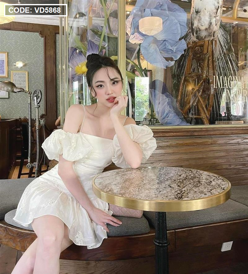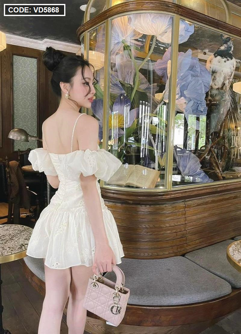 Chuyên sỉ đầm kem xô thêu 2 dây vai rớt phồng tùng bèo