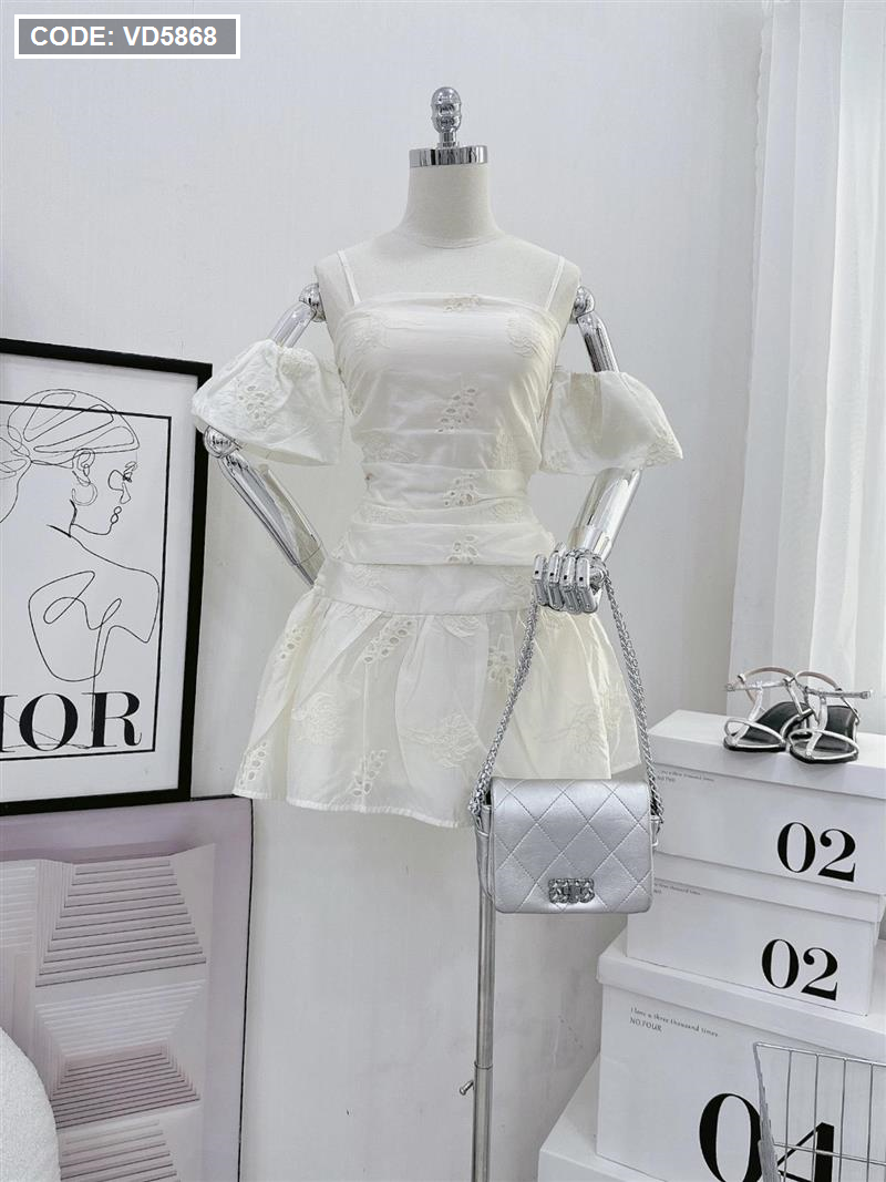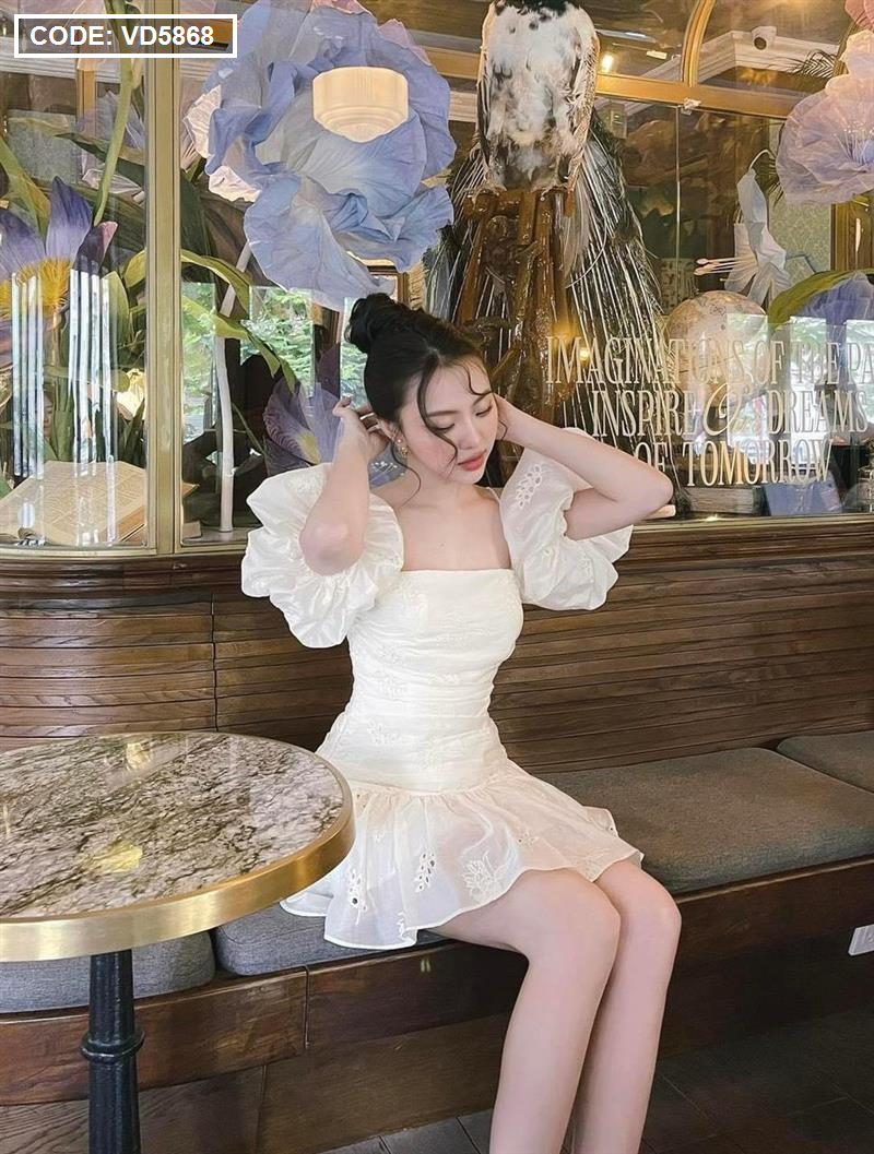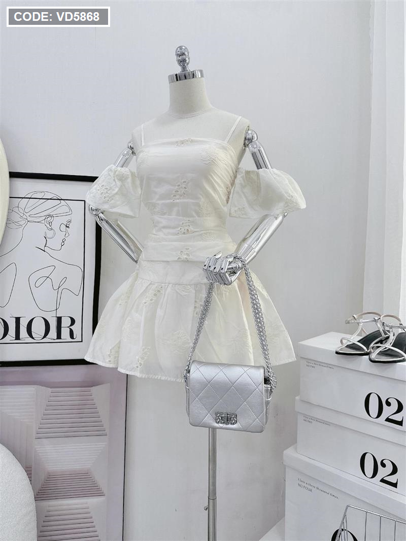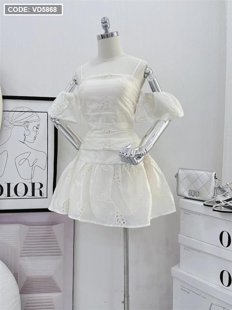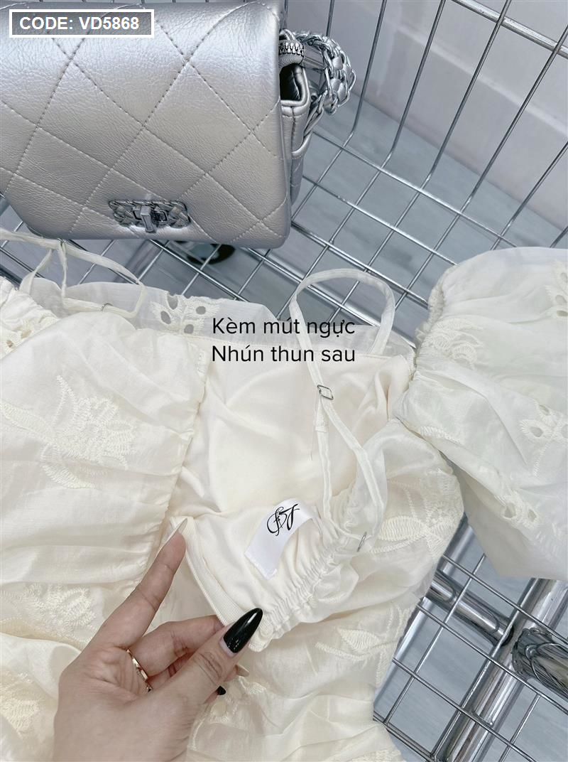 Chuyên sỉ đầm kem xô thêu 2 dây vai rớt phồng tùng bèo