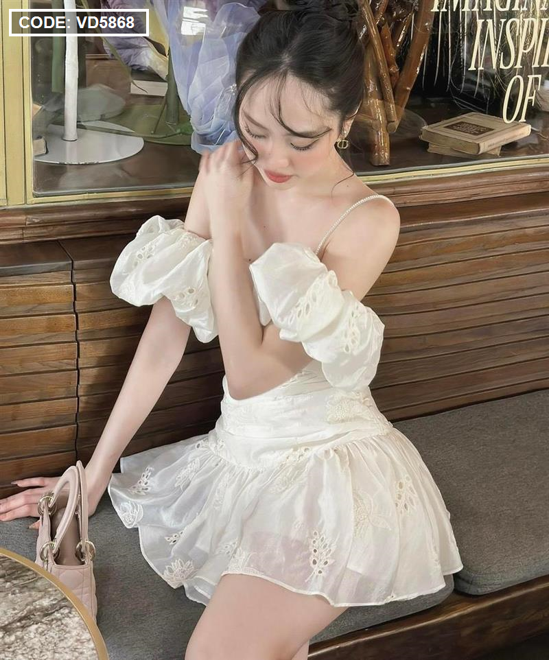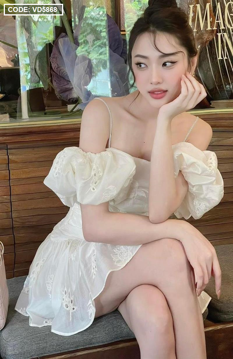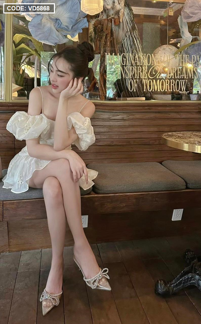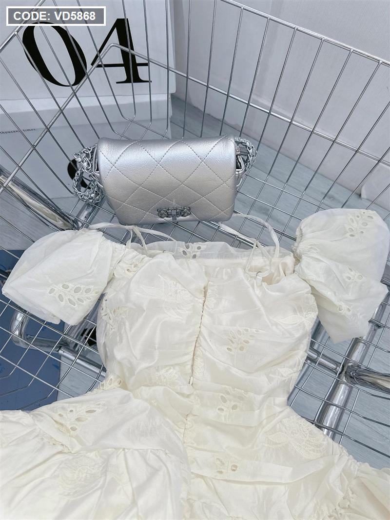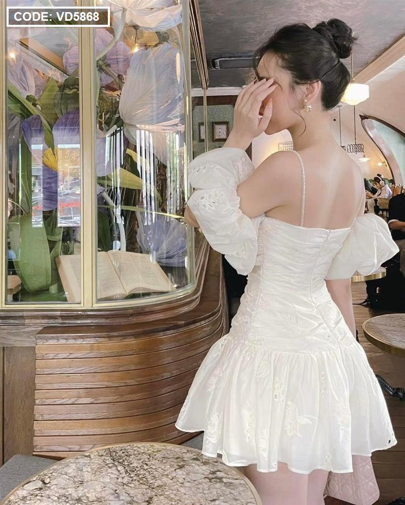 Chuyên sỉ đầm kem xô thêu 2 dây vai rớt phồng tùng bèo
