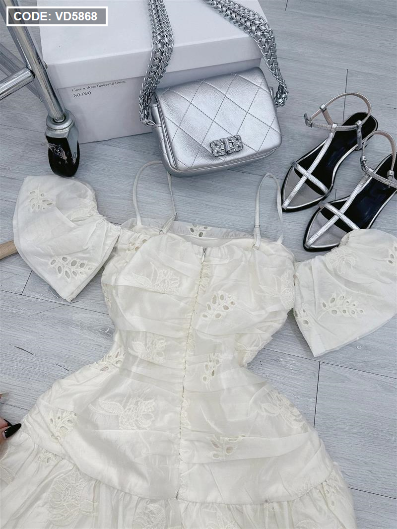 Đầm kem xô thêu 2 dây vai rớt phồng tùng bèo