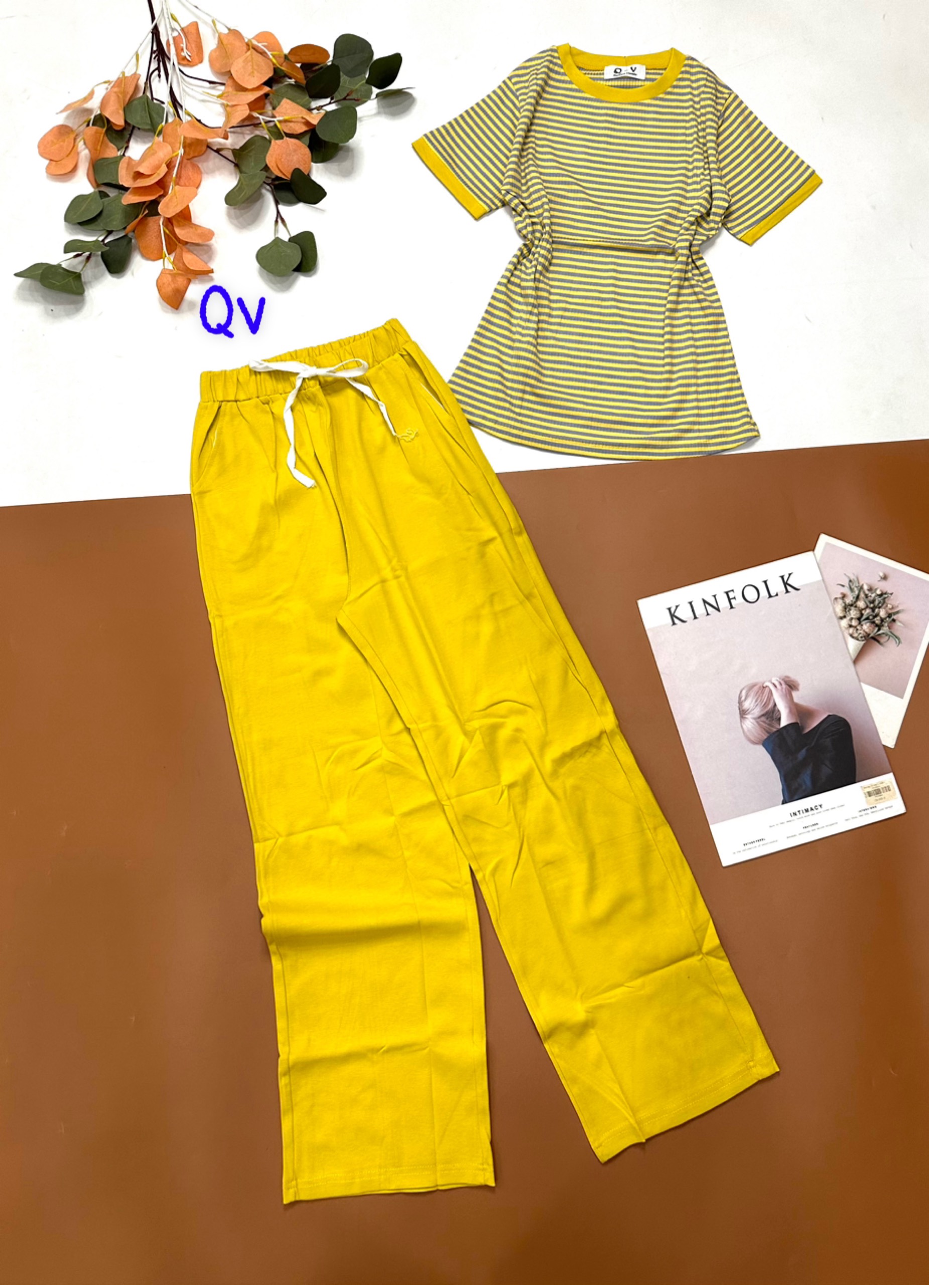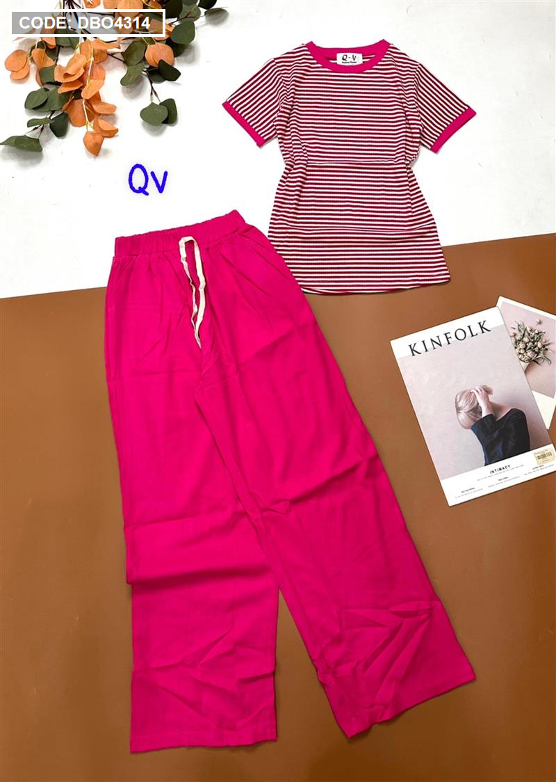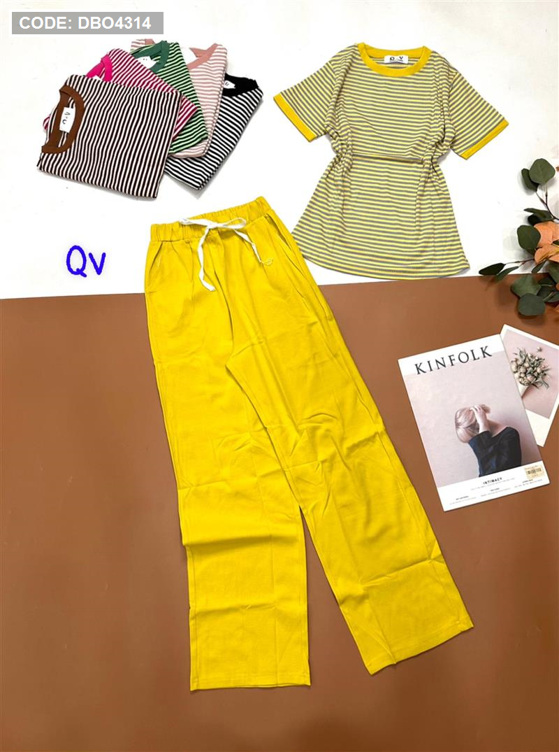 Đồ bộ quần dài trơn áo cổ tròn sọc tay ngắn
