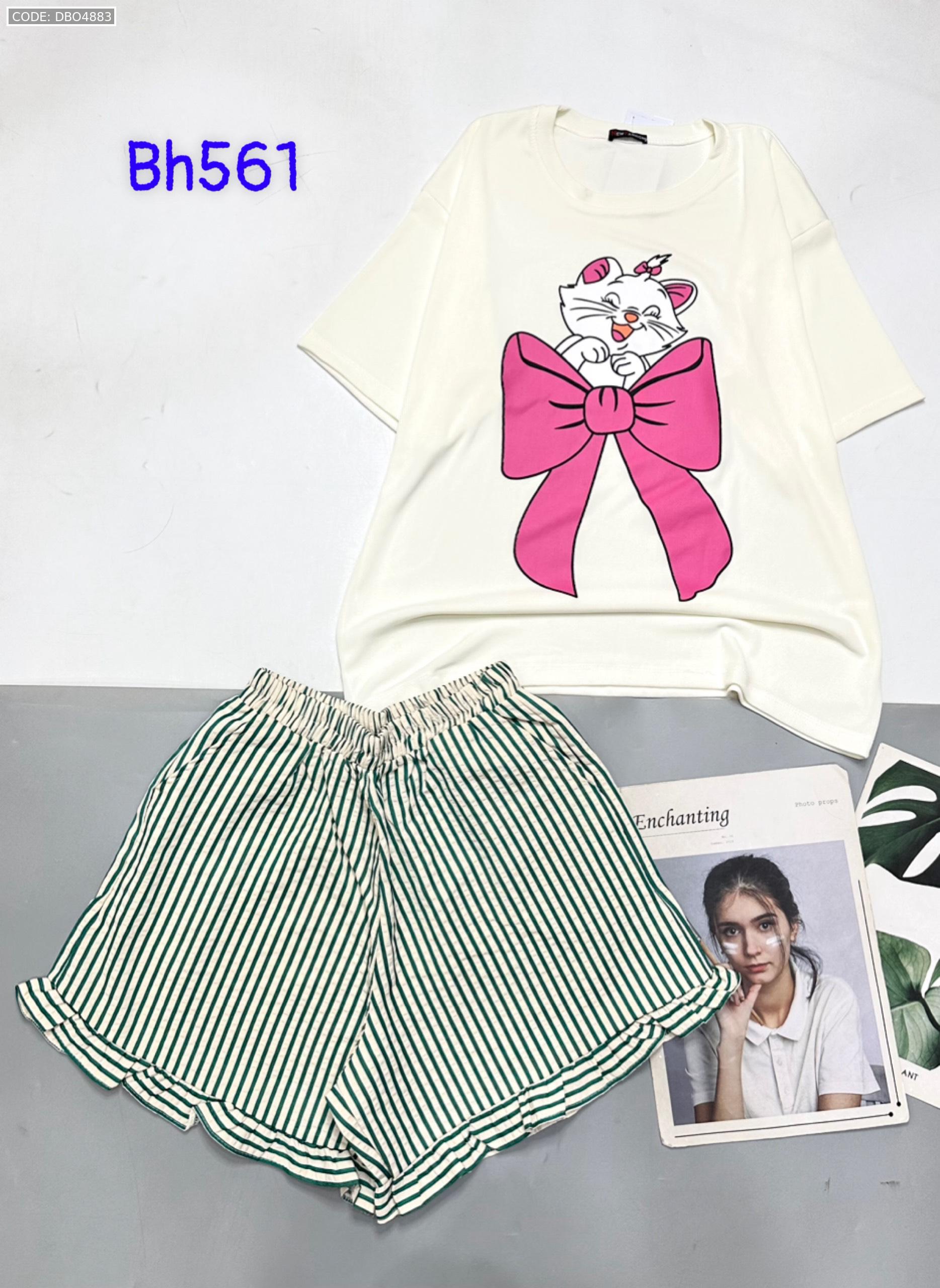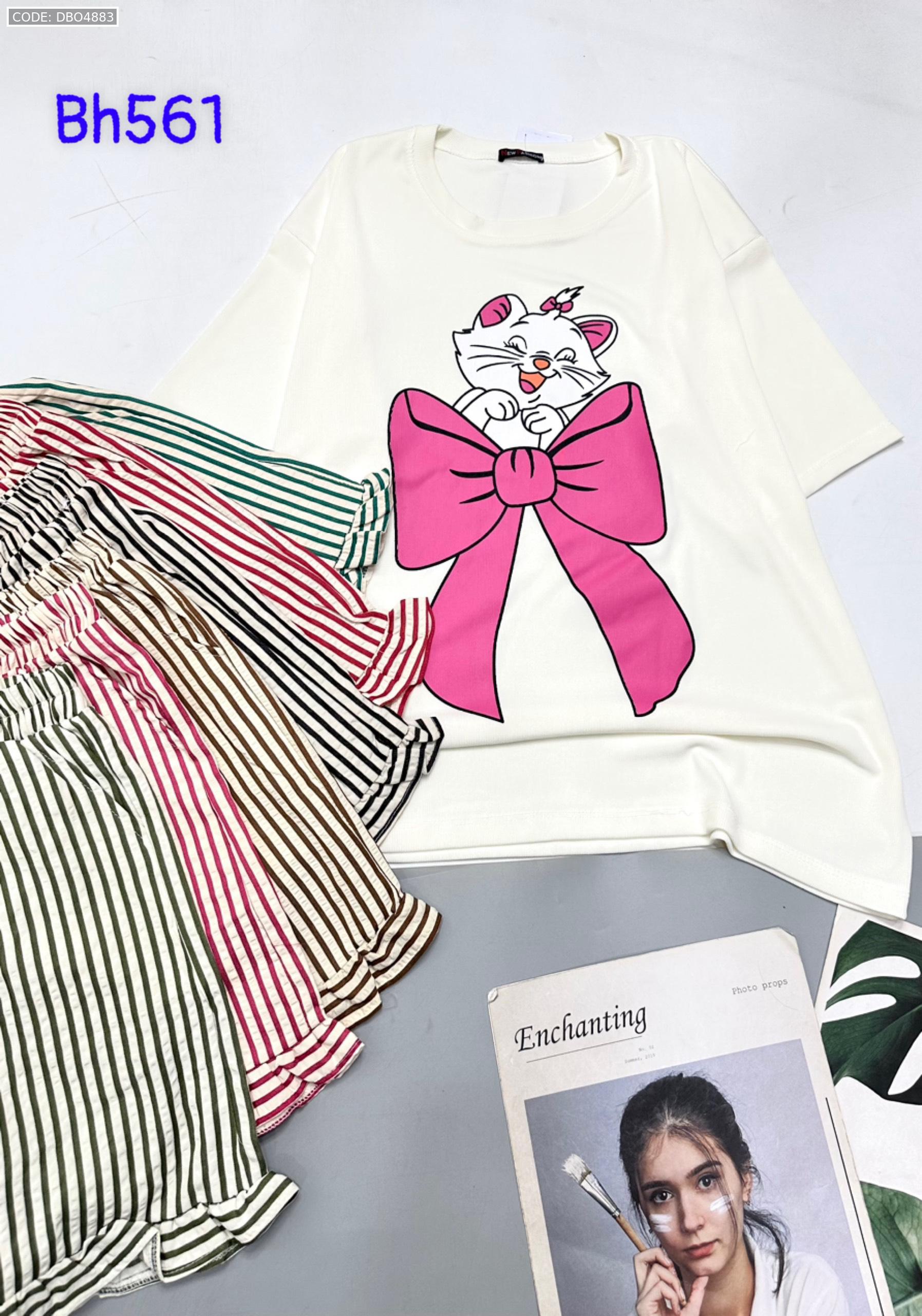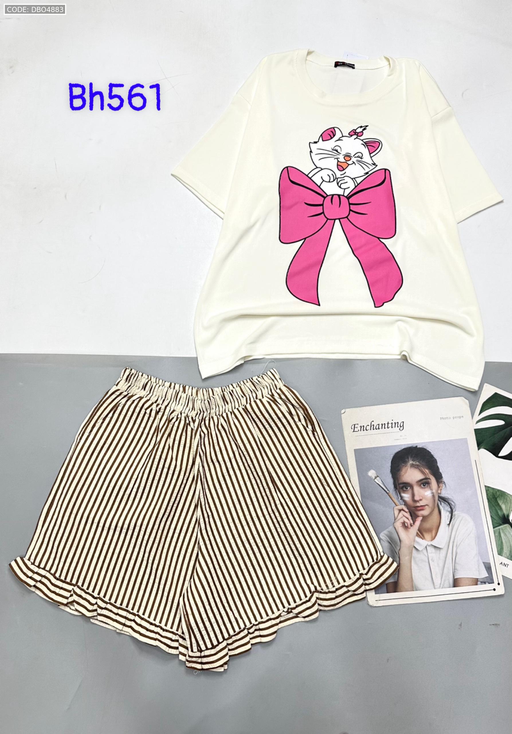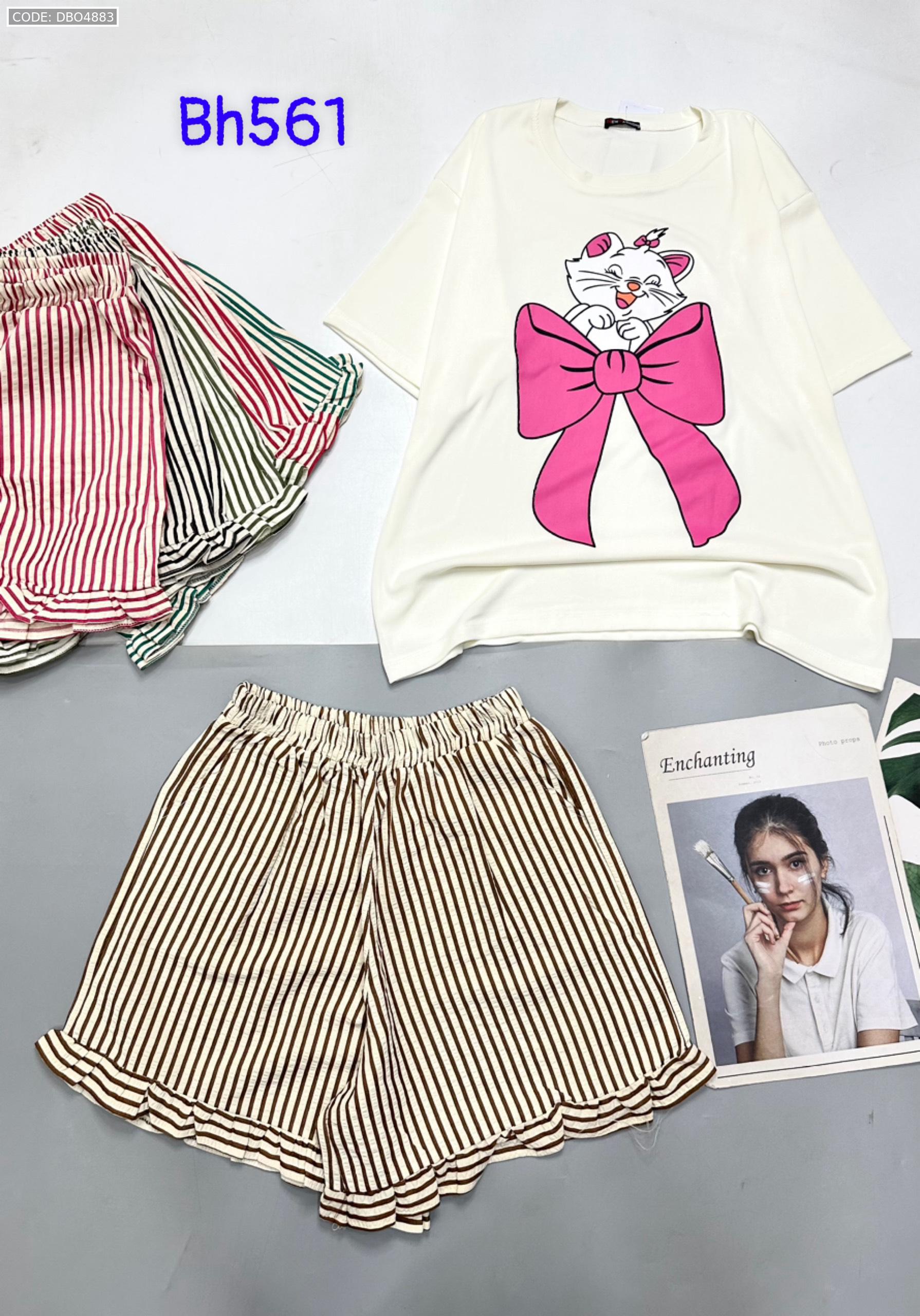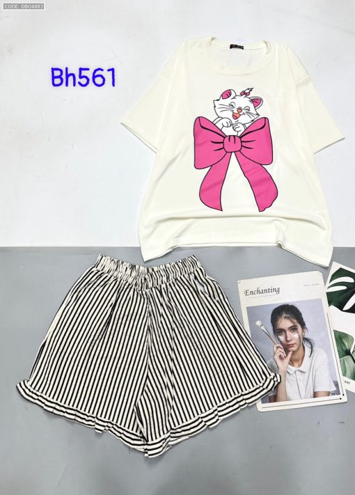 Chuyên sỉ đồ bộ quần đùi bèo sọc áo tay ngắn in mèo nơ