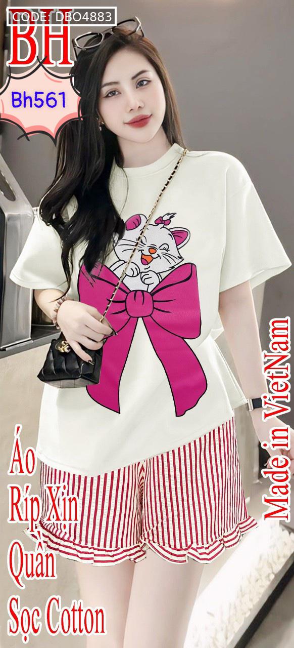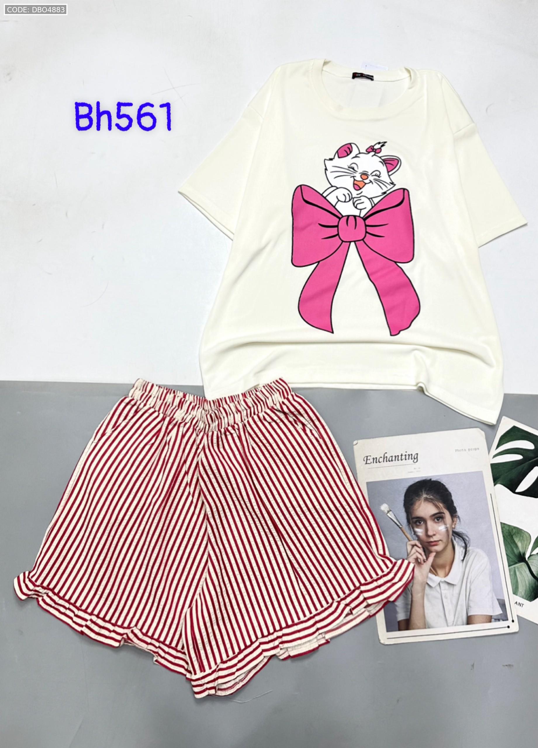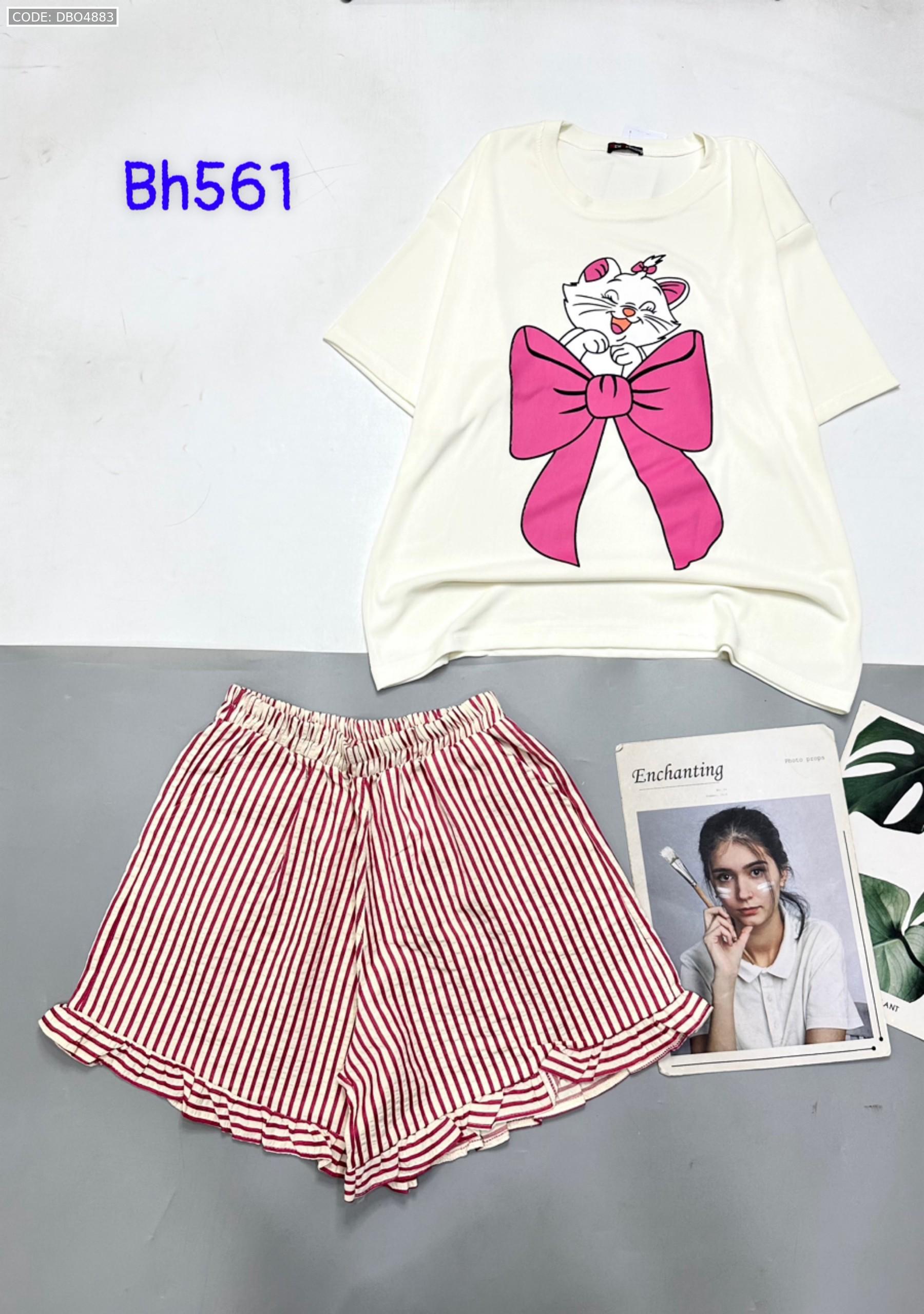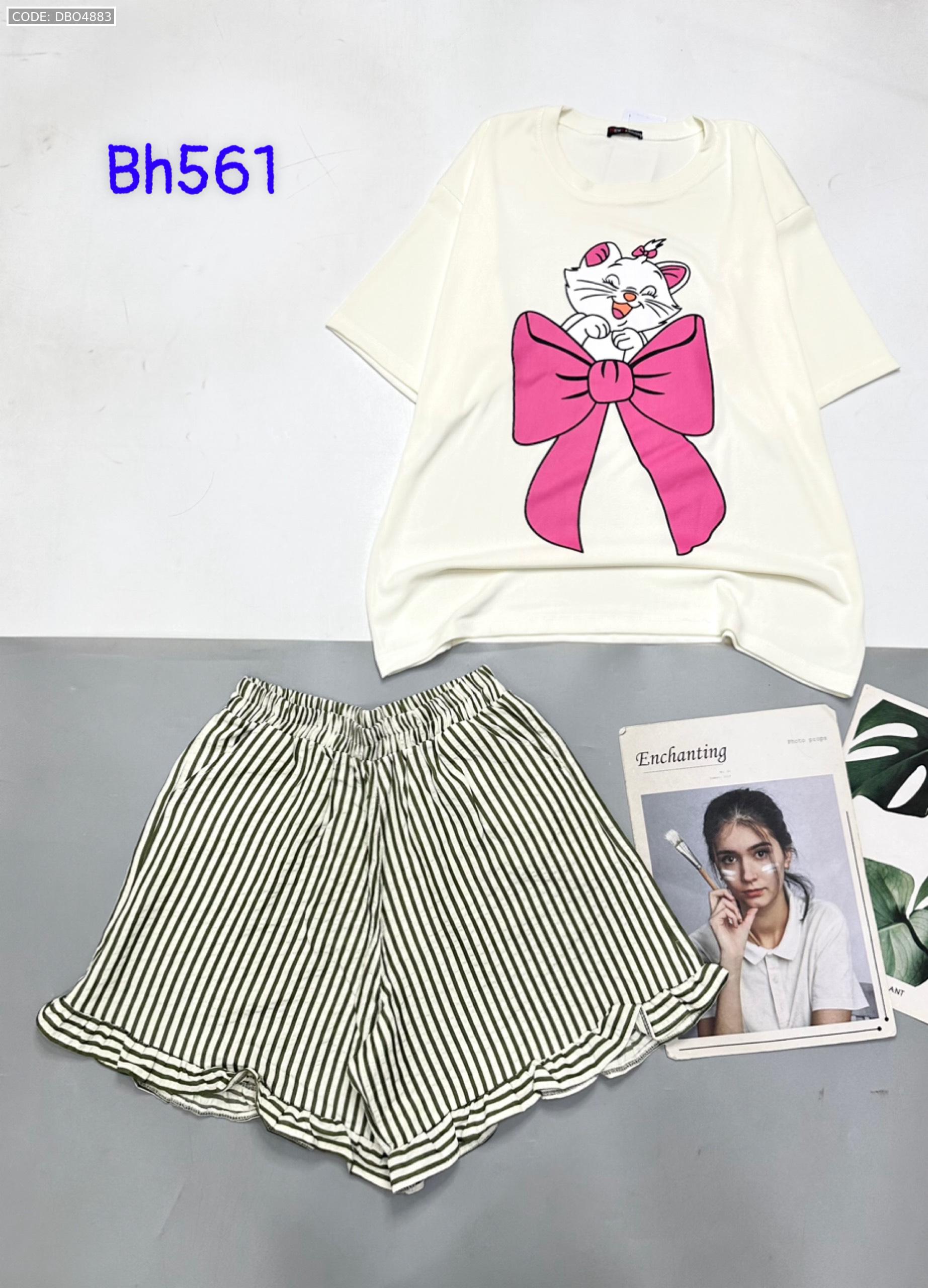 Chuyên sỉ đồ bộ quần đùi bèo sọc áo tay ngắn in mèo nơ