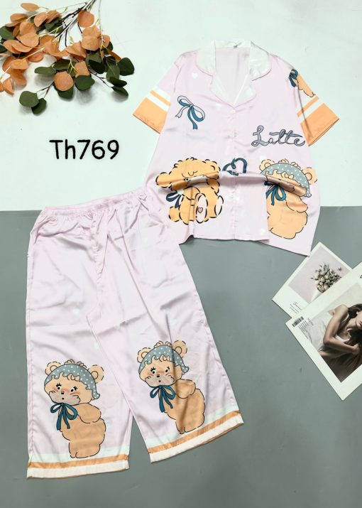Chuyên sỉ đồ bộ satin quần lửng pijama tay ngắn cổ bẻ hoạ tiết