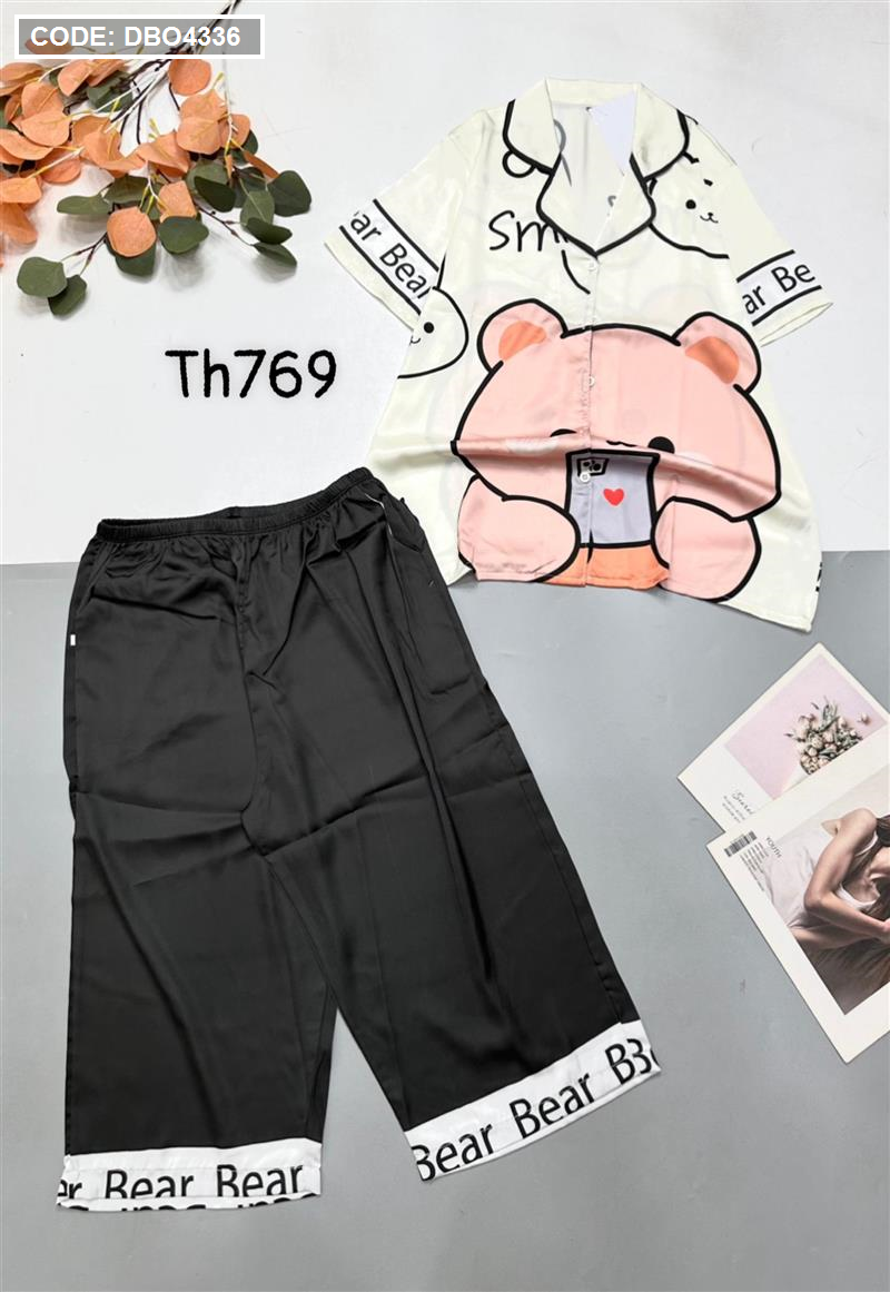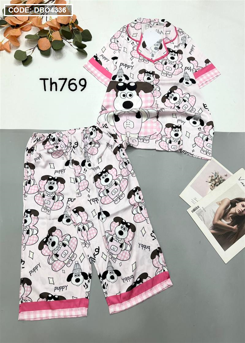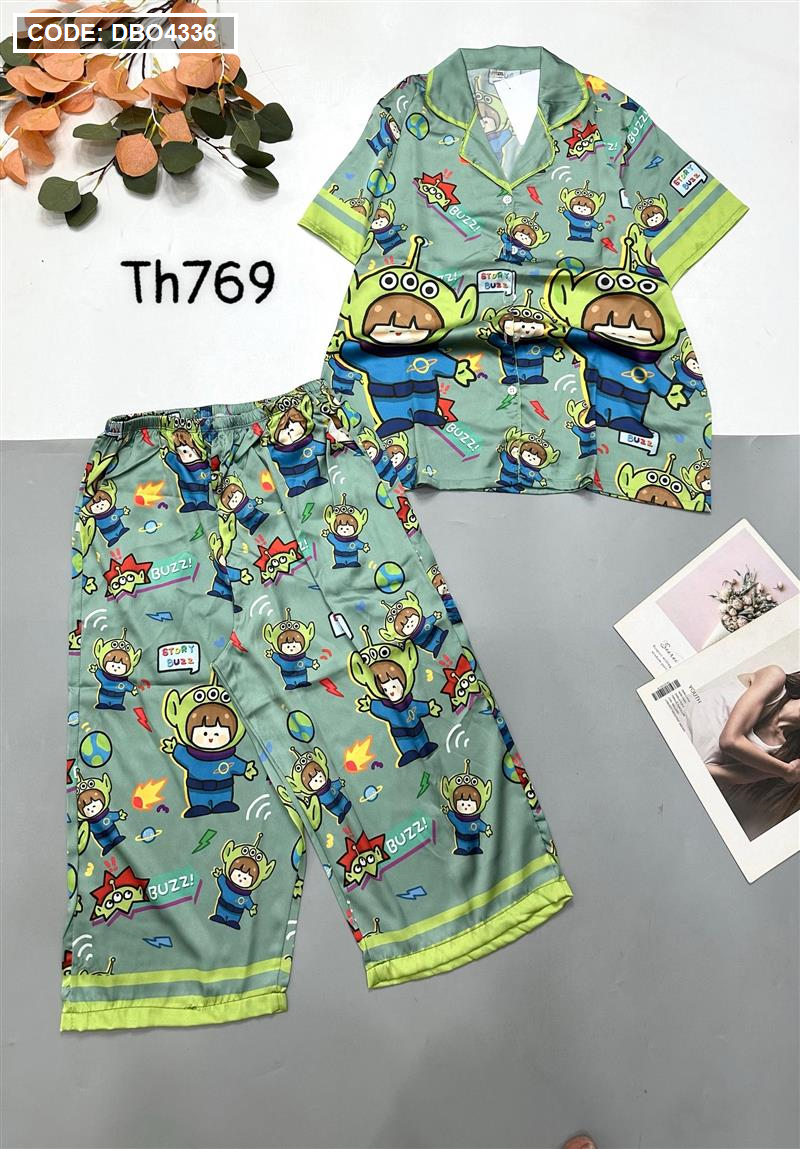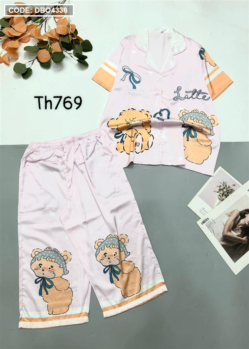Đồ bộ satin quần lửng pijama tay ngắn cổ bẻ hoạ tiết