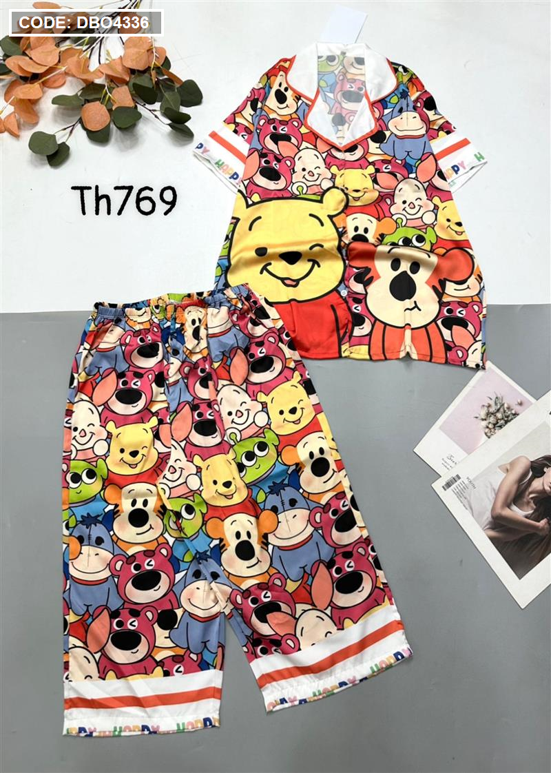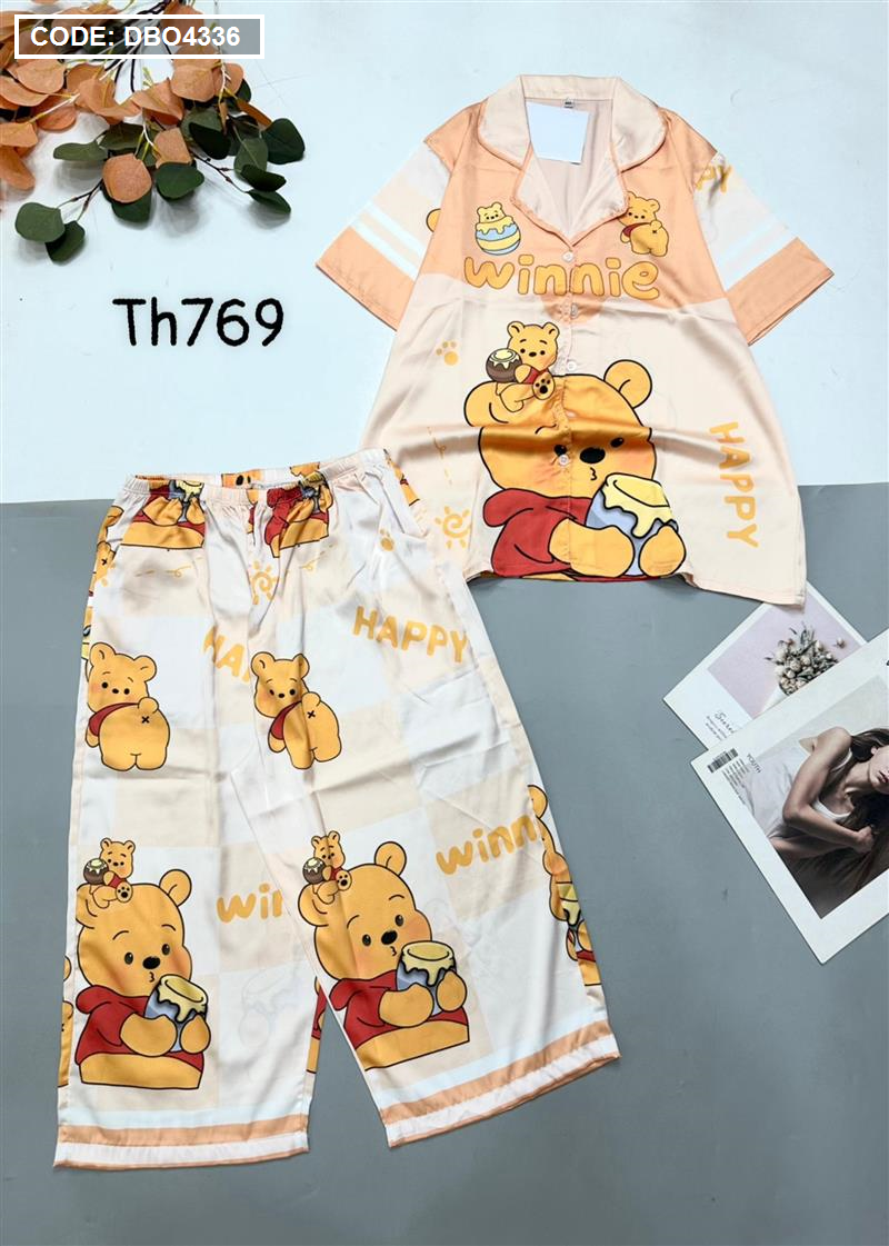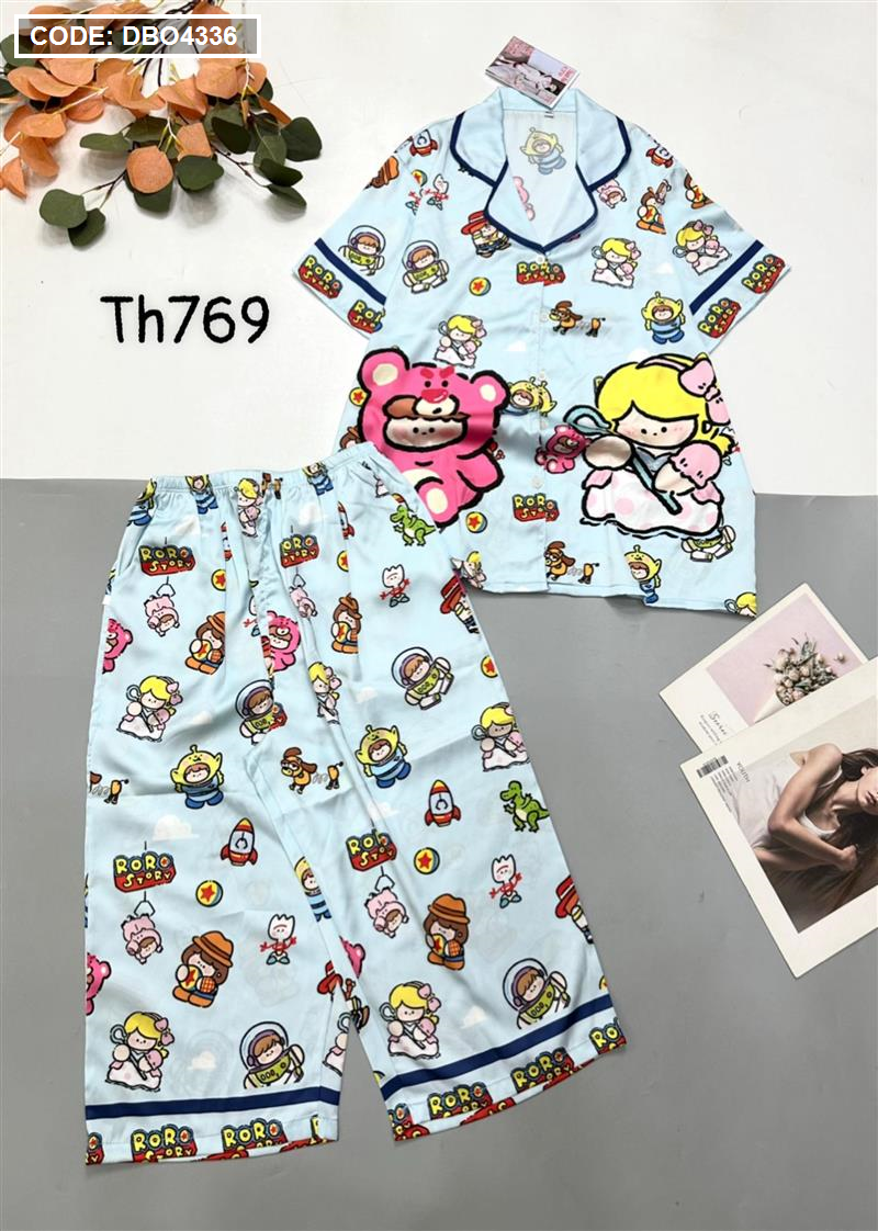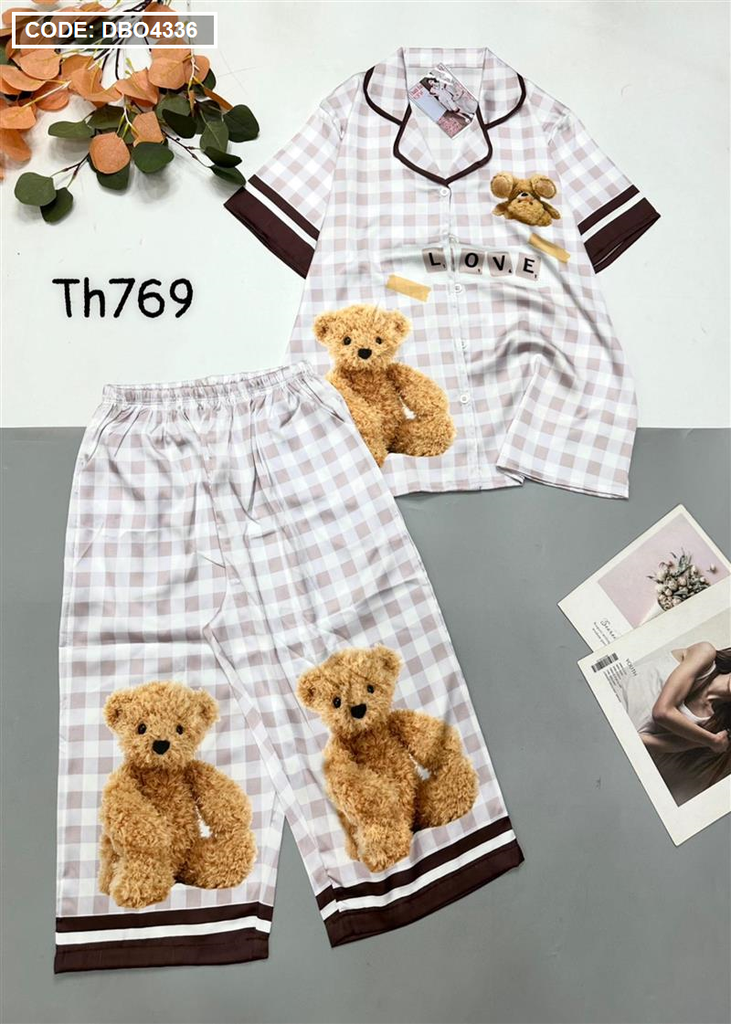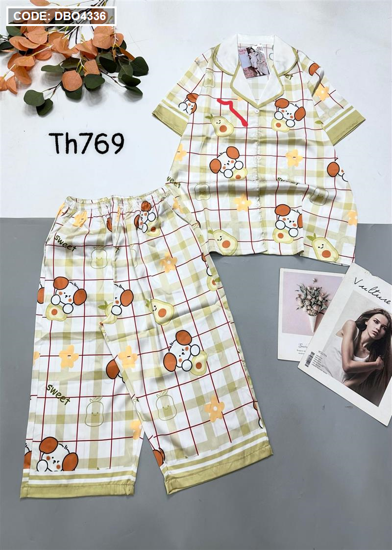 Đồ bộ satin quần lửng pijama tay ngắn cổ bẻ hoạ tiết