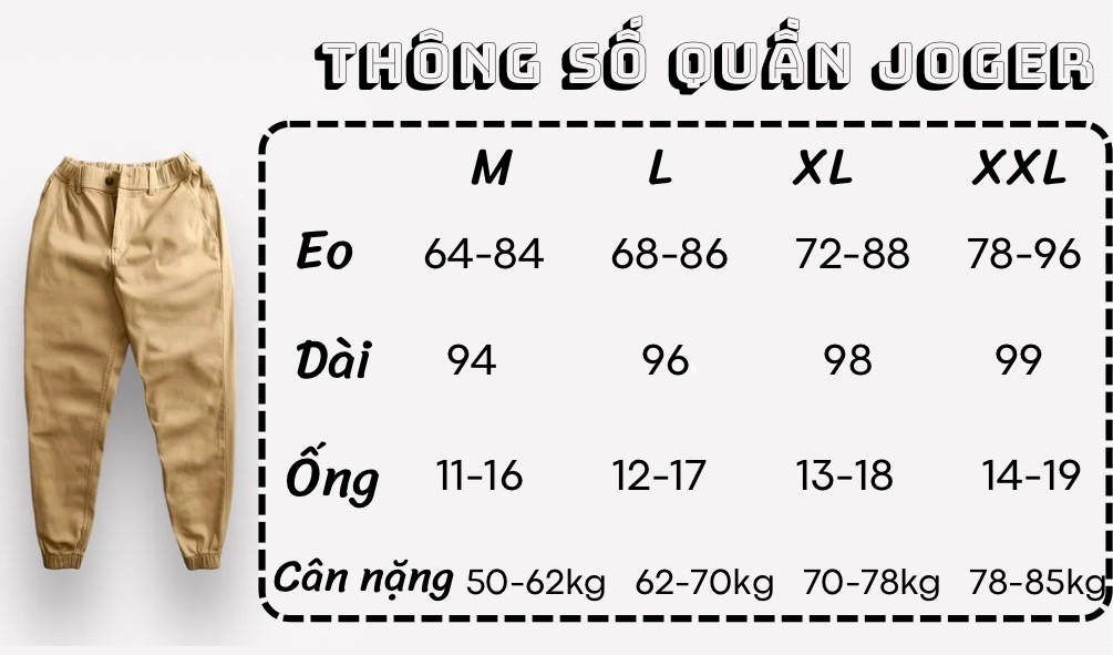 Sản phẩm được thiết kế với kiểu dáng Jogger hiện đại, ôm sát vừa phải và có độ rộng chân tiêu chuẩn, giúp cho người mặc trông tự tin và lịch lãm. Quần có 4 size khác nhau để bạn lựa chọn.
