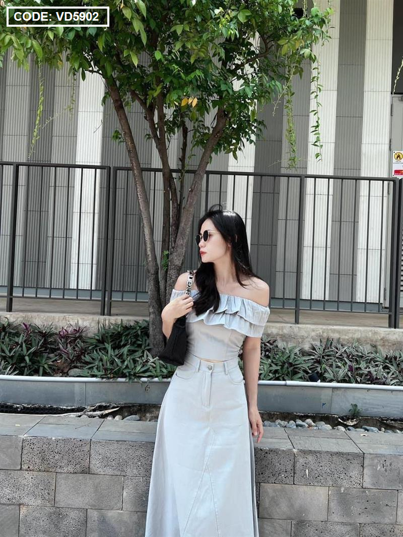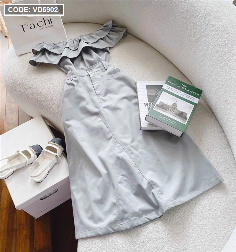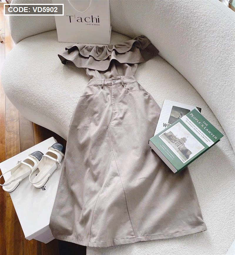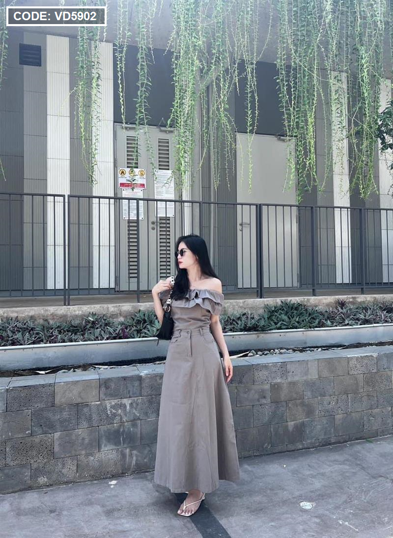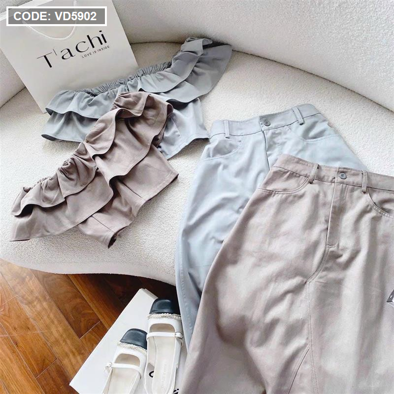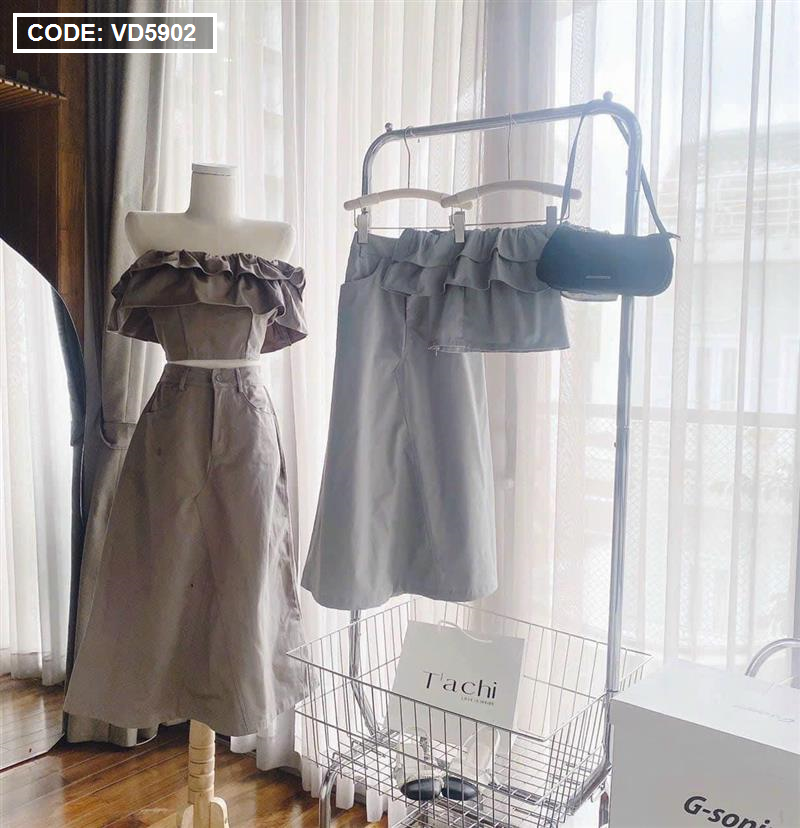 Chuyên sỉ sét crop kaki bèo trễ vai + chân váy midi kaki