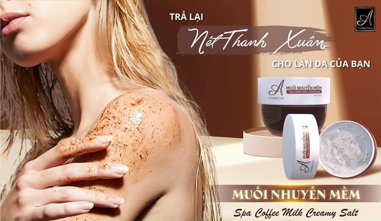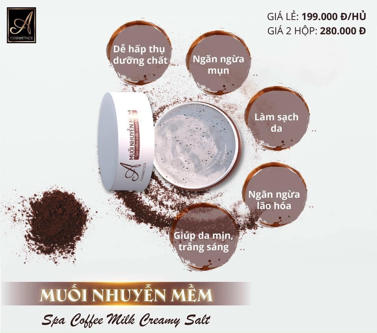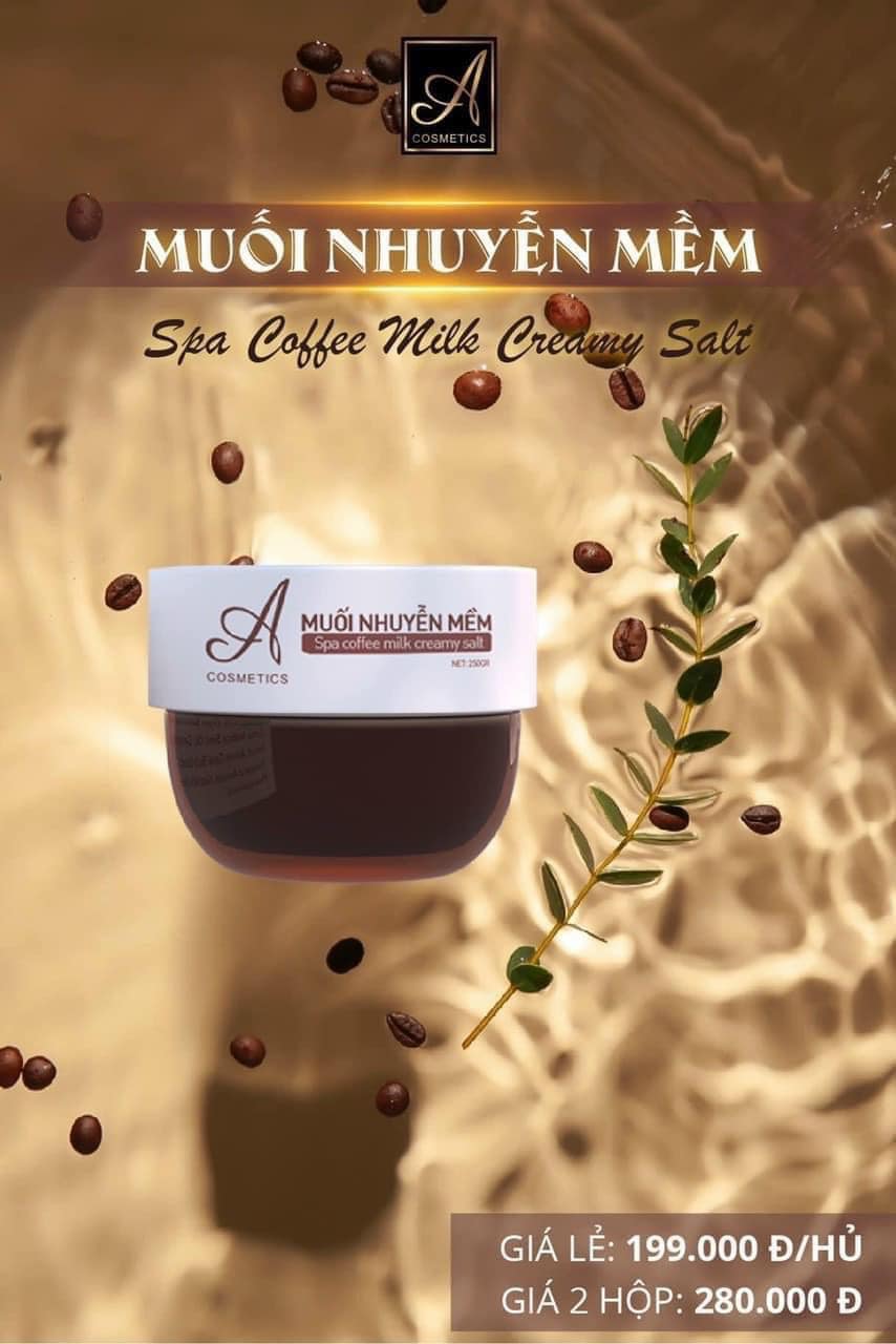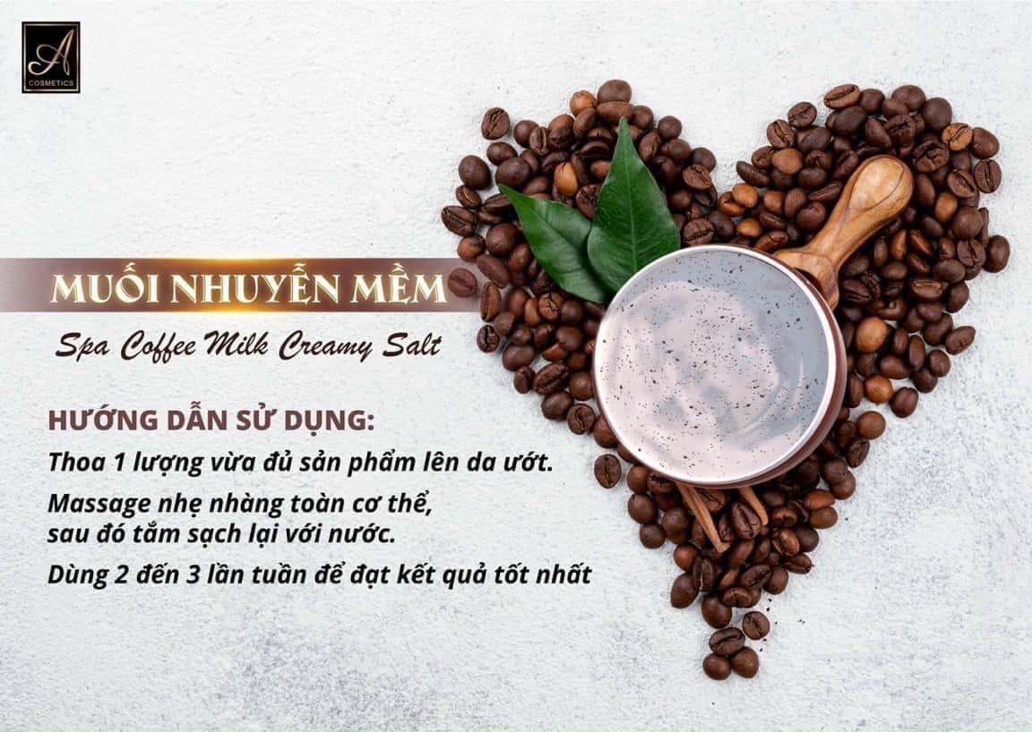 Muối Nhuyễn Mềm – Spa Coffee Milk Creamy Salt thuộc dòng sản phẩm tẩy tế bào chết trên cơ thể thông qua quá trình tắm giúp làm sạch da, ngăn ngừa mụn và lão hóa da được sản xuất bởi A Cosmetics.