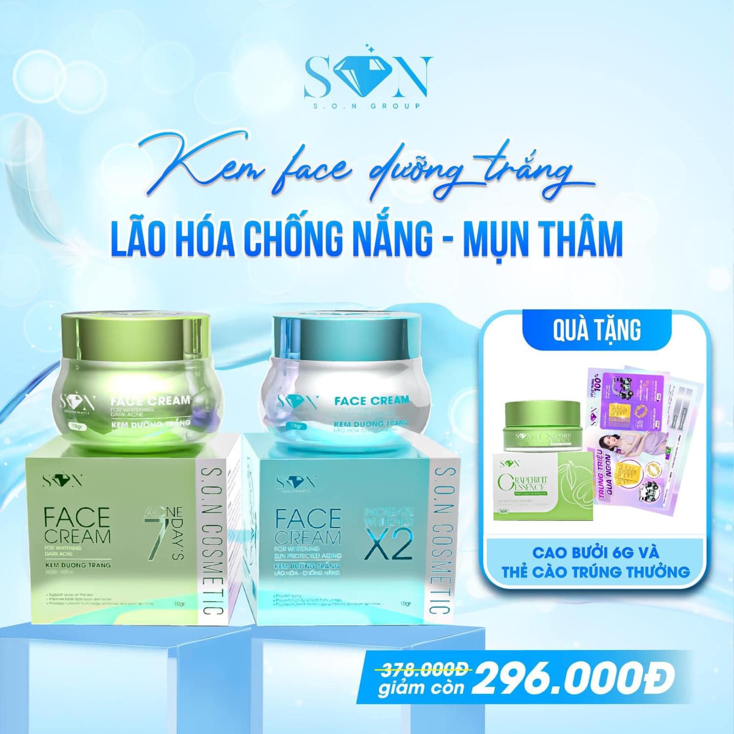 Combo Kem Face Hỗ Trợ Giảm Mụn Xanh Lá + Xanh Biển SON Cosmetic Tặng Cao Bưởi Phiên Bản Mới