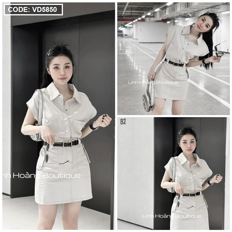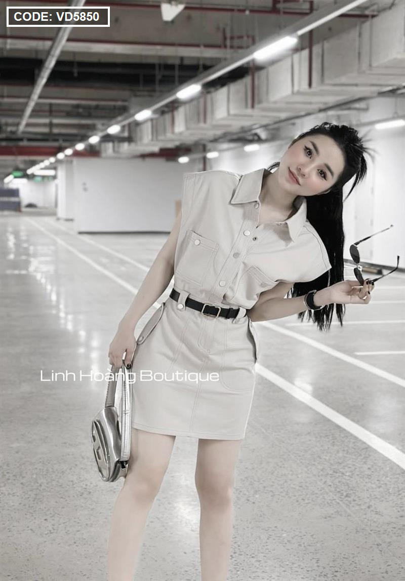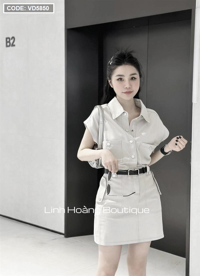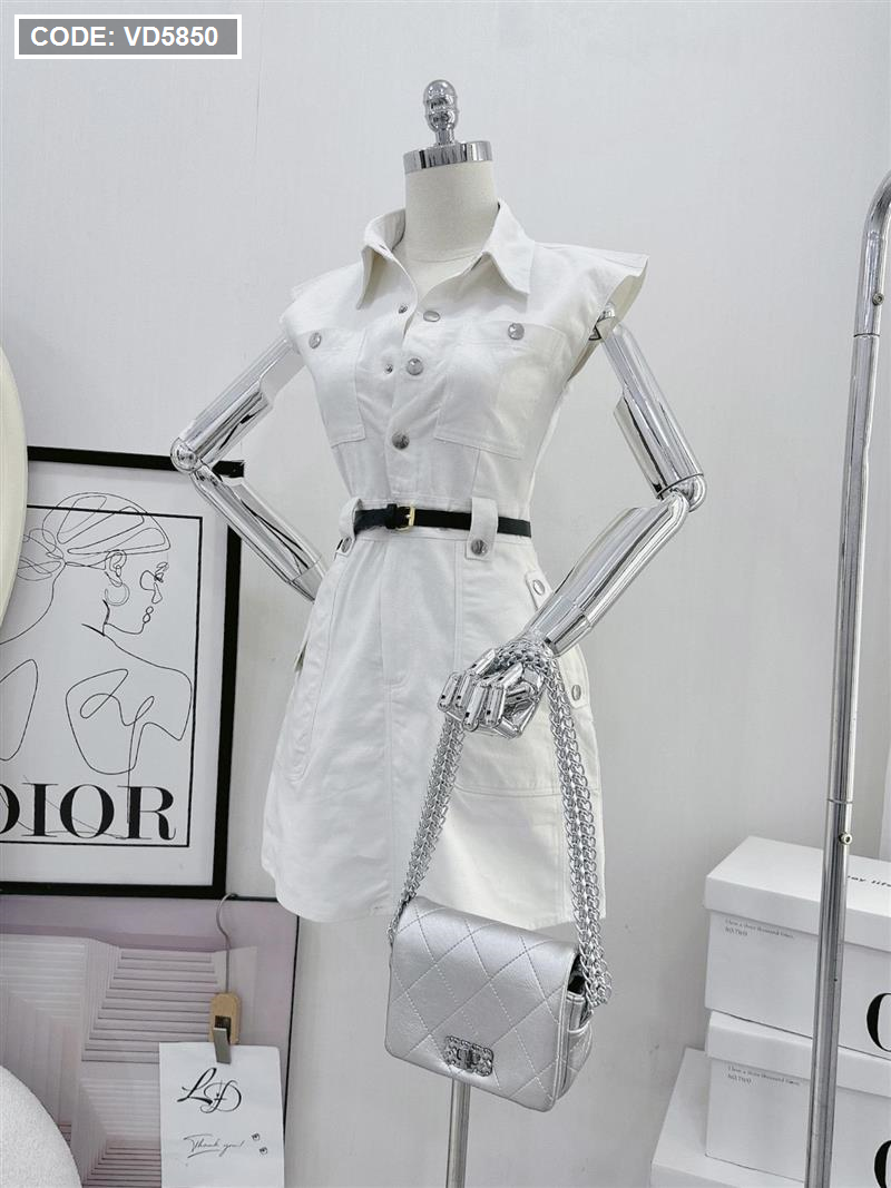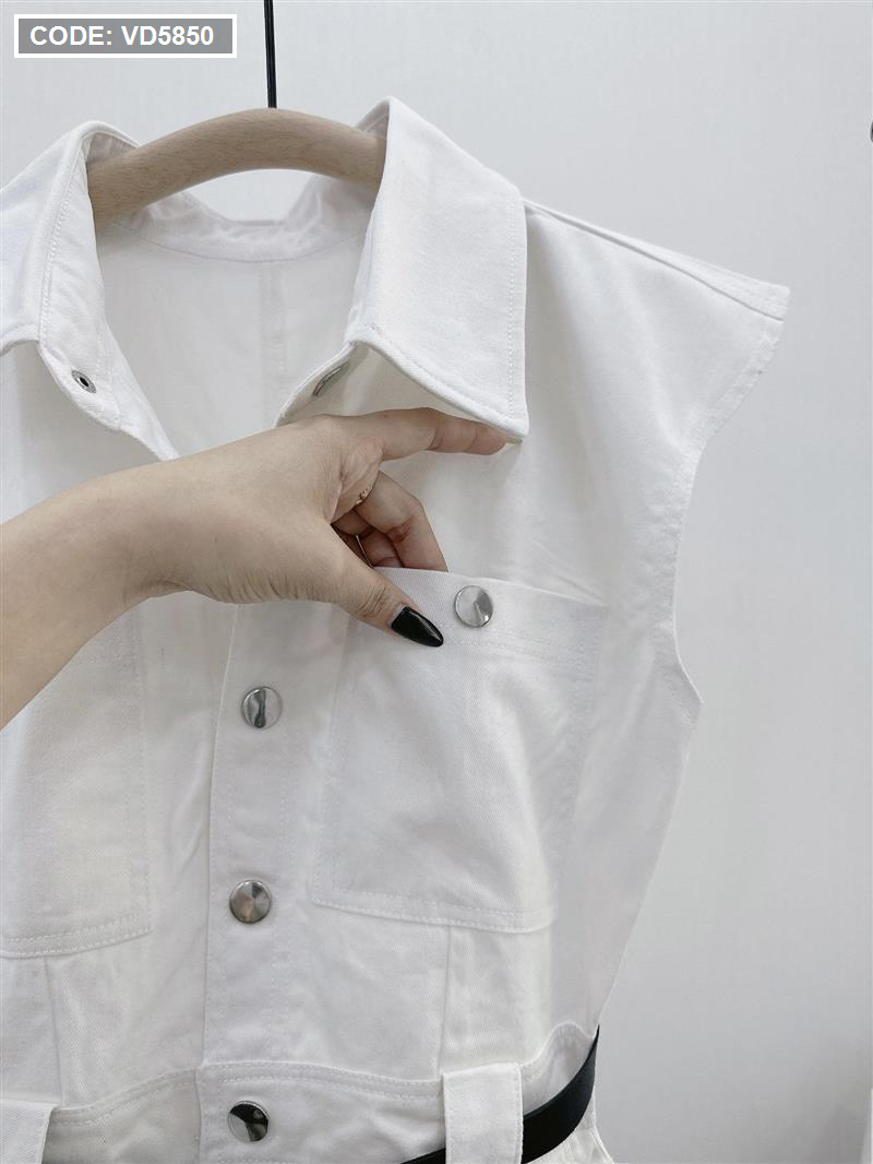 Đầm kaki trắng sữa nút bấm 4 nút kèm nịt